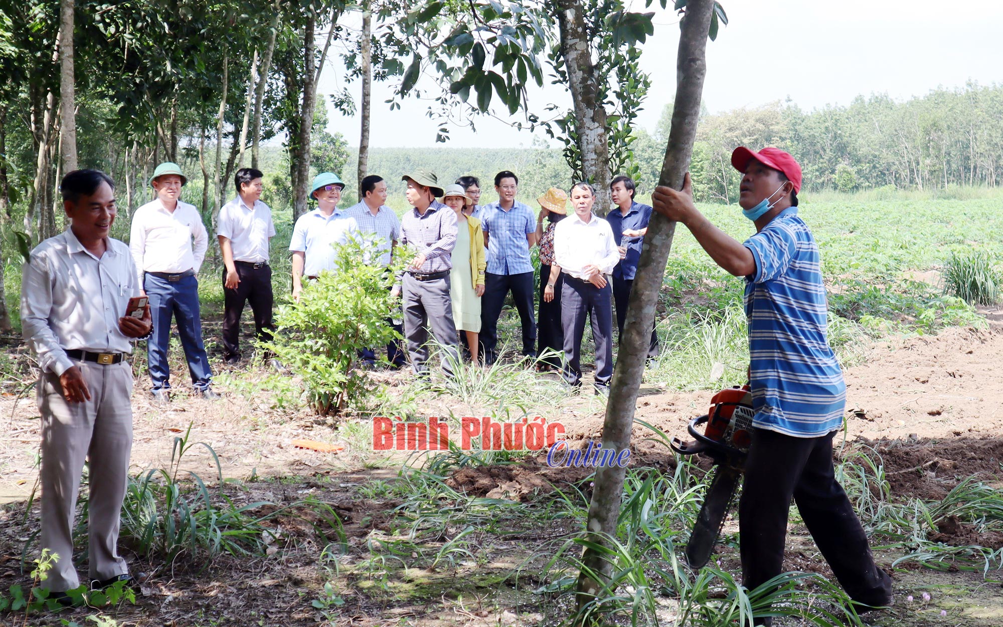 Lãnh đạo thành phố Đồng Xoài và phường Tiến Thành chứng kiến người dân tự nguyện cắt hạ cây cao su để bàn giao mặt bằng thi công dự án