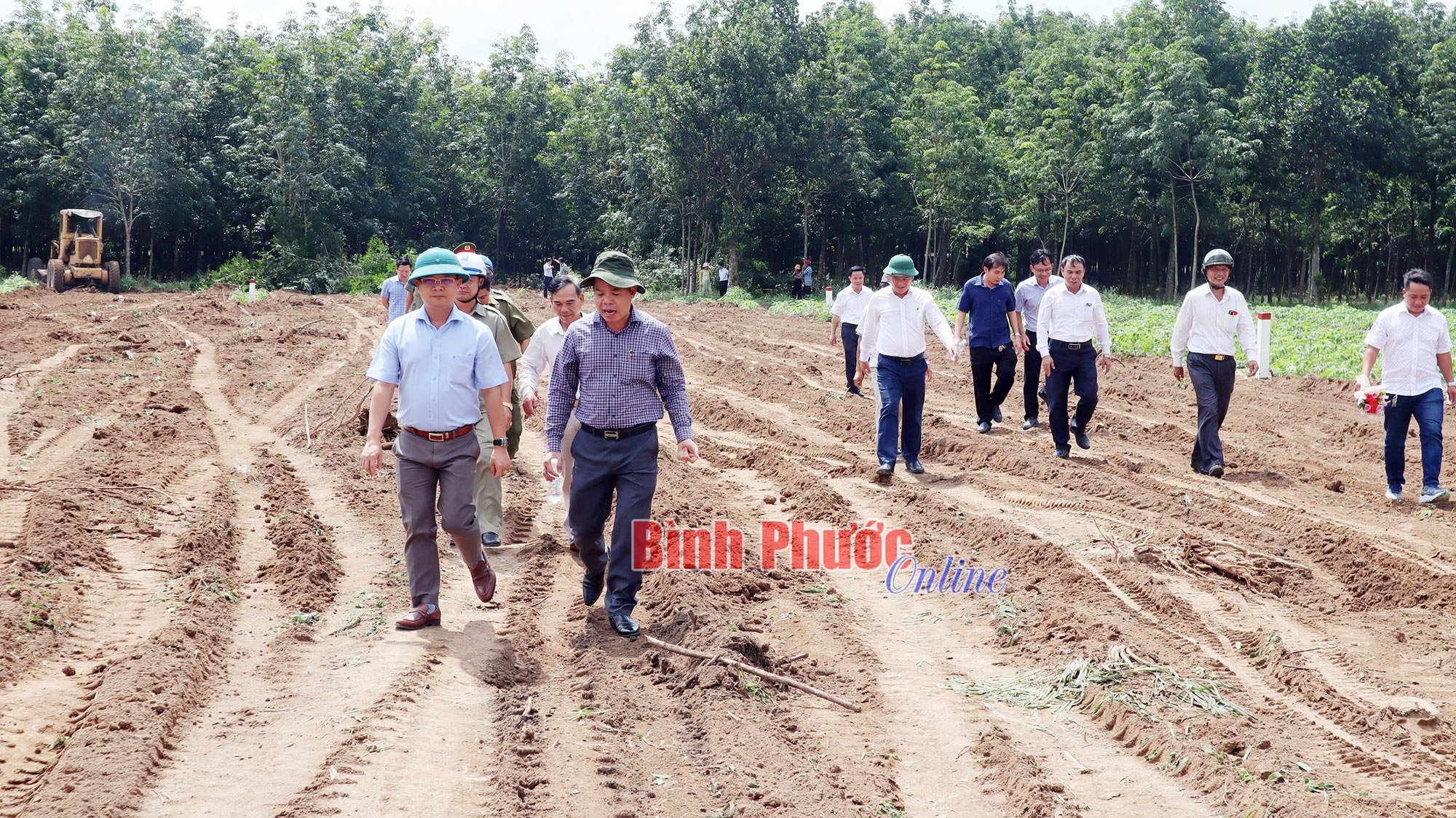 Lãnh đạo và các phòng, ban chuyên môn thành phố Đồng Xoài kiểm tra khu đất rộng hàng chục ngàn mét vuông do người dân hiến tặng để thông tuyến đường vành đai phía Nam thành phố Đồng Xoài