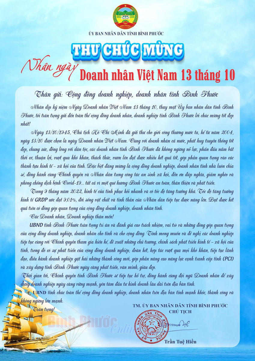 Nhân dịp kỷ niệm Ngày Doanh nhân Việt Nam 13 tháng 10, thay mặt Ủy ban nhân dân tỉnh Bình Phước, tôi trân trọng gửi đến toàn thể cộng đồng doanh nhân, doanh nghiệp tỉnh Bình Phước lời chúc mừng tốt đẹp nhất!