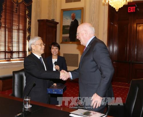 ![]() Tổng Bí thư Nguyễn Phú Trọng gặp các Nghị sĩ Hoa Kỳ do nguyên Chủ tịch Thường trực Thượng viện Hoa Kỳ Patrick Leahy chủ trì. |
