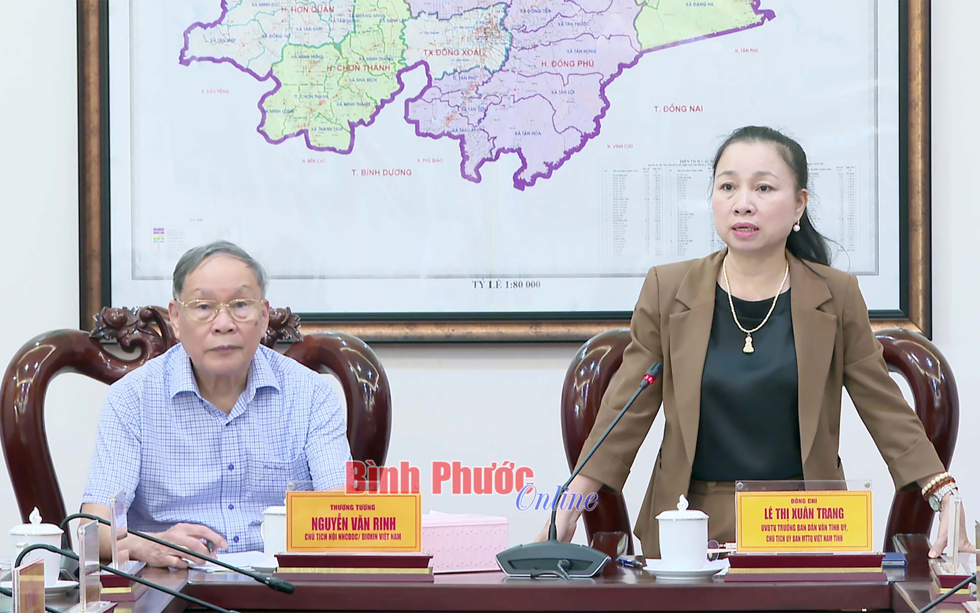 Ủy viên Ban Thường vụ, Trưởng ban Dân vận Tỉnh ủy, Chủ tịch UBMTTQVN tỉnh Bình Phước Lê Thị Xuân Trang và lãnh đạo một số sở, ngành của tỉnh làm việc với đoàn.
