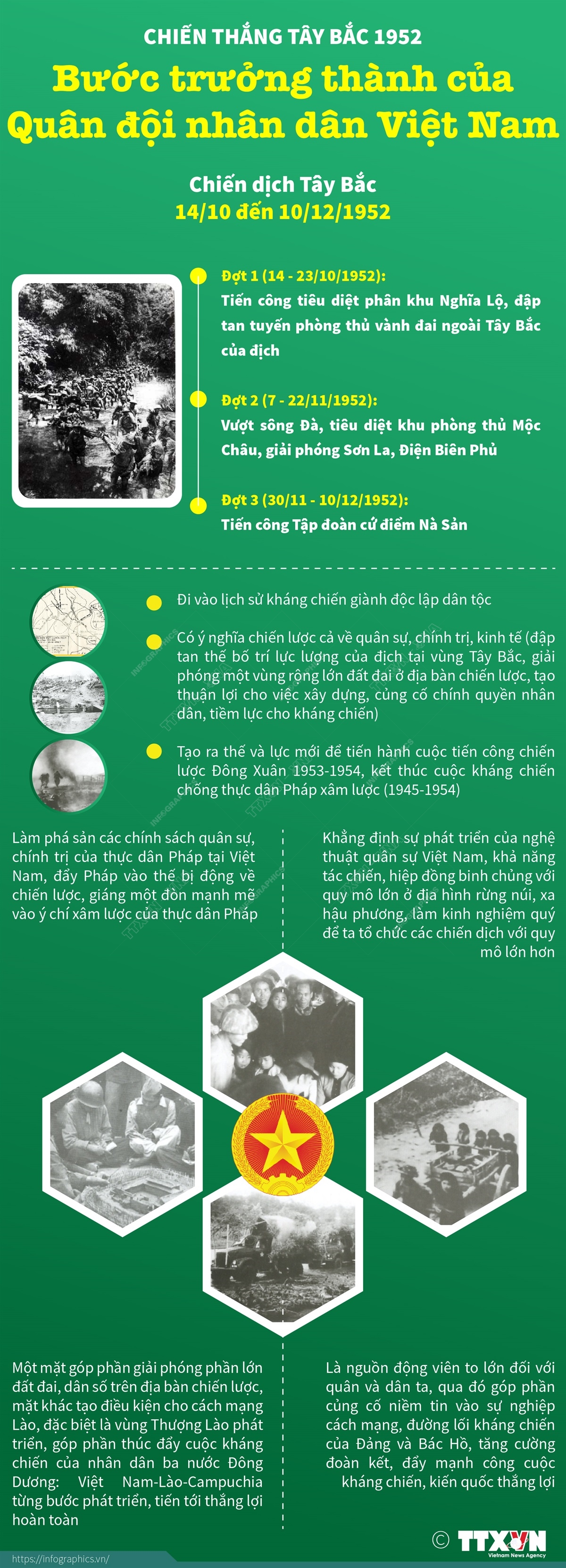 Ngày 14-10-1952, Chiến dịch Tây Bắc chính thức mở màn với đợt tiến công đầu tiên vào phân khu Nghĩa Lộ, tiêu diệt tuyến phòng thủ vành đai ngoài Tây Bắc của địch. Sau gần 2 tháng (14-10 đến 10-12-1952), quân và dân ta đã làm nên Chiến thắng Tây Bắc 1952. Chiến thắng này đã đi vào lịch sử cuộc kháng chiến chống thực dân Pháp của dân tộc, là một trong những chiến công oanh liệt, có ý nghĩa chiến lược, làm chuyển biến cục diện chiến tranh theo hướng có lợi cho ta, góp phần tạo thế và lực mới tiến tới giành thắng lợi cuối cùng trong chiến cuộc Đông Xuân 1953-1954.