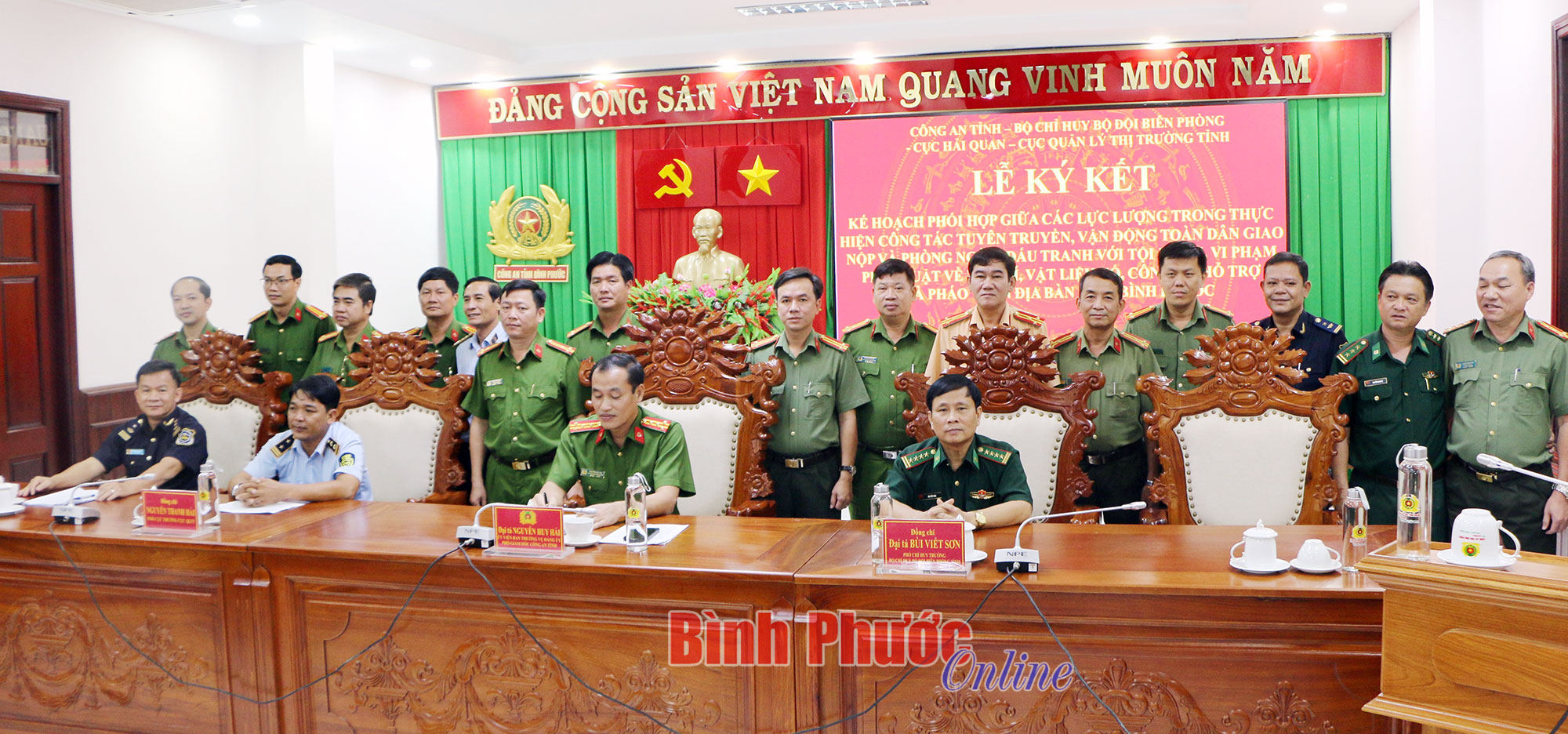 Đại tá Nguyễn Huy Hải, Phó Giám đốc Công an tỉnh; Đại tá Bùi Viết Sơn, Phó Chỉ huy trưởng Bộ Chỉ huy Bộ đội Biên phòng tỉnh; Phó Cục trưởng Cục Hải quan tỉnh Phan Văn Dũng; Phó Cục trưởng Cục Quản lý thị trường tỉnh Nguyễn Thanh Hải cùng ký kết phối hợp.