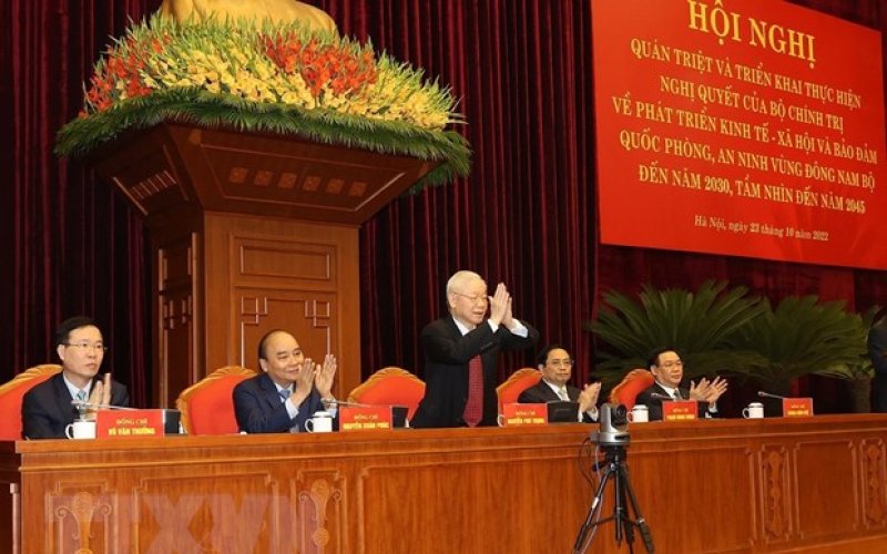 Tổng Bí thư chủ trì hội nghị triển khai Nghị quyết về vùng Đông Nam BộSáng 23-10, tại Hà Nội, Tổng Bí thư Nguyễn Phú Trọng triển khai thực hiện Nghị quyết của Bộ Chính trị về phương hướng phát triển KT-XH bảo đảm quốc phòng vùng Đông Nam Bộ đến năm 2030, tầm nhìn 2045.
