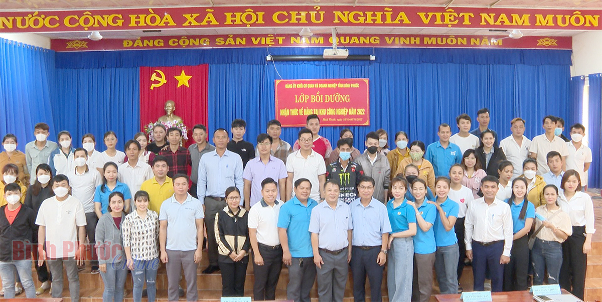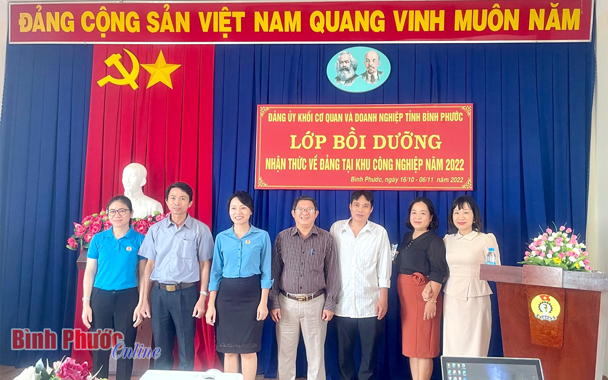 Đại diện lãnh đạo Đảng ủy Khối Cơ quan và Doanh nghiệp tỉnh, Công đoàn các KCN tỉnh, Công đoàn KCN khu vực Đồng Xoài - Đồng Phú chụp hình lưu niệm với ban cán sự và học viên lớp bồi dưỡng nhận thức về Đảng ở các KCN