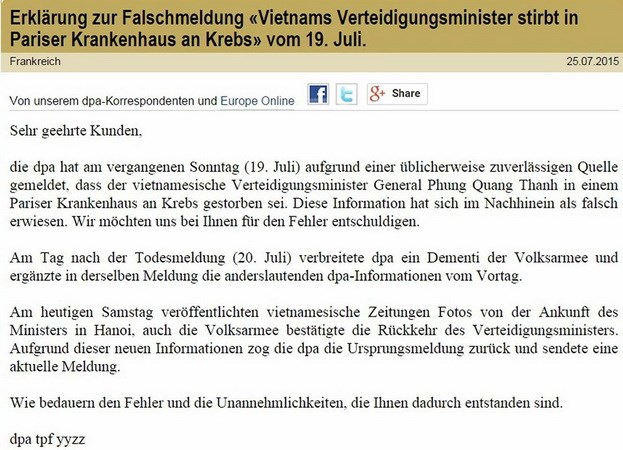 Một ngày sau khi đưa tin Bộ trưởng Phùng Quang Thanh qua đời (20-7), DPA đã đăng tin phản bác của Quân đội Nhân dân Việt Nam và đã đưa thêm vào tin những thông tin trái ngược của DPA đăng ngày trước đó.