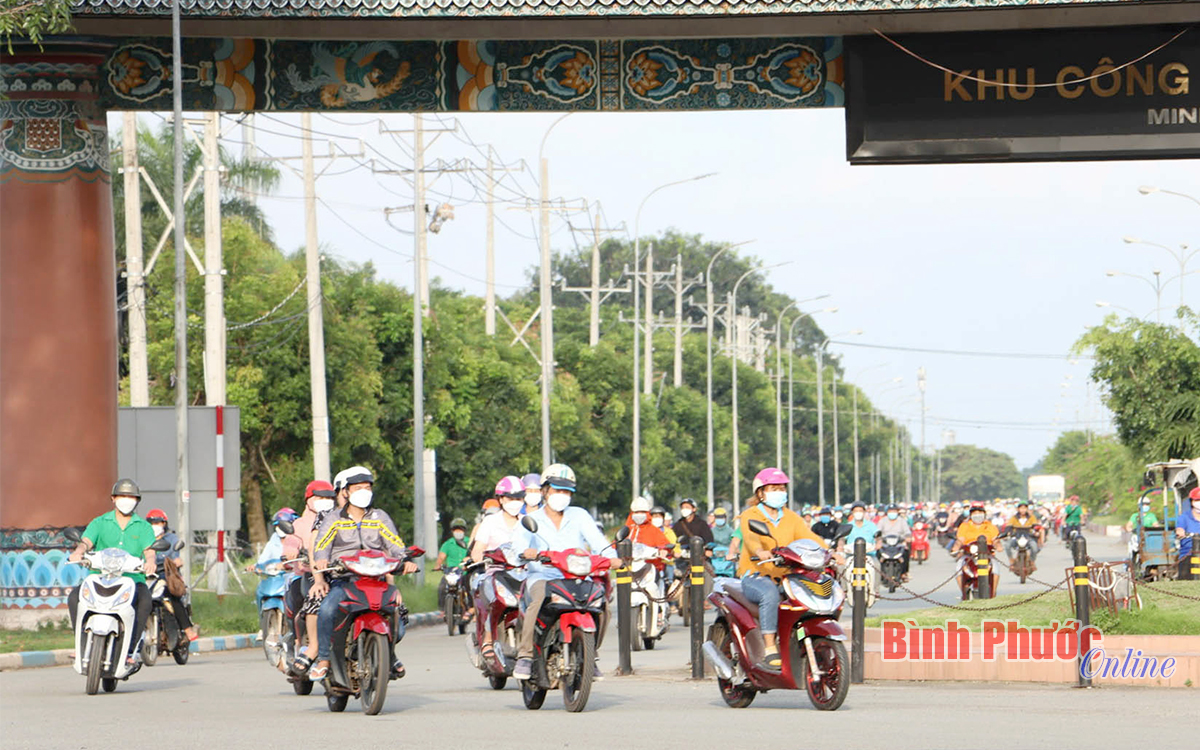 Các khu công nghiệp trên địa bàn thị xã Chơn Thành đã thu hút khoảng 30 ngàn lao động đến làm việc. Hiện 2 khu công nghiệp Minh Hưng III và Minh Hưng - Hàn Quốc có 15 đảng viên. Trong ảnh: Công nhân Khu công nghiệp Minh Hưng - Hàn Quốc giờ tan ca