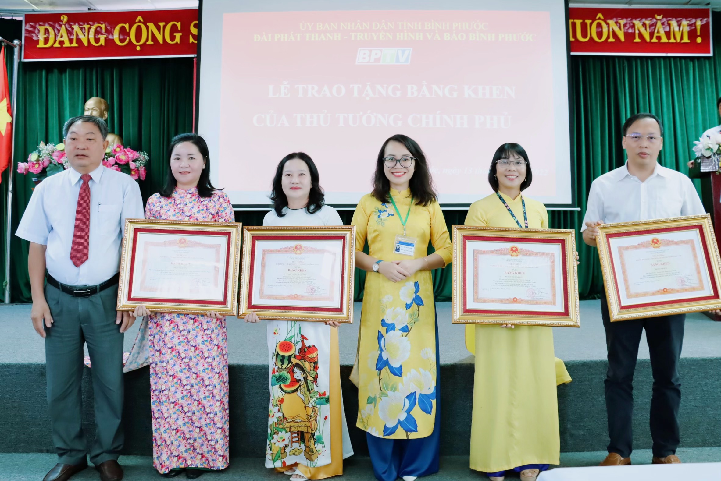 Thừa ủy quyền của Hội đồng Thi đua khen thưởng tỉnh, Giám đốc - Tổng Biên tập BPTV Nguyễn Thị Minh Nhâm, Thành viên hội đồng và Phó Giám đốc - Phó Tổng Biên tập Cao Minh Trực trao tặng bằng khen của Thủ tướng Chính phủ cho tập thể Phòng Thời sự BPTV và 3 cá nhân gồm: Trưởng phòng Chuyên mục - Chuyên đề Phạm Thị Thanh Phương; Phó Trưởng phòng Thời sự Phạm Thị Quyên và nhà báo Huỳnh Thị Minh Huệ, Phòng Văn nghệ - Giải trí - Quốc tế BPTV