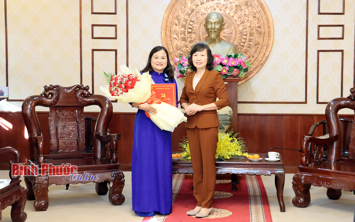 Phó Bí thư Thường trực Tỉnh ủy, Chủ tịch HĐND tỉnh Huỳnh Thị Hằng trao quyết định của Ban Bí thư về việc chuẩn y Ủy viên, Phó Chủ nhiệm Ủy ban Kiểm tra Tỉnh ủy Bình Phước nhiệm kỳ 2020-2025 đối với bà Tạ Thu Thủy