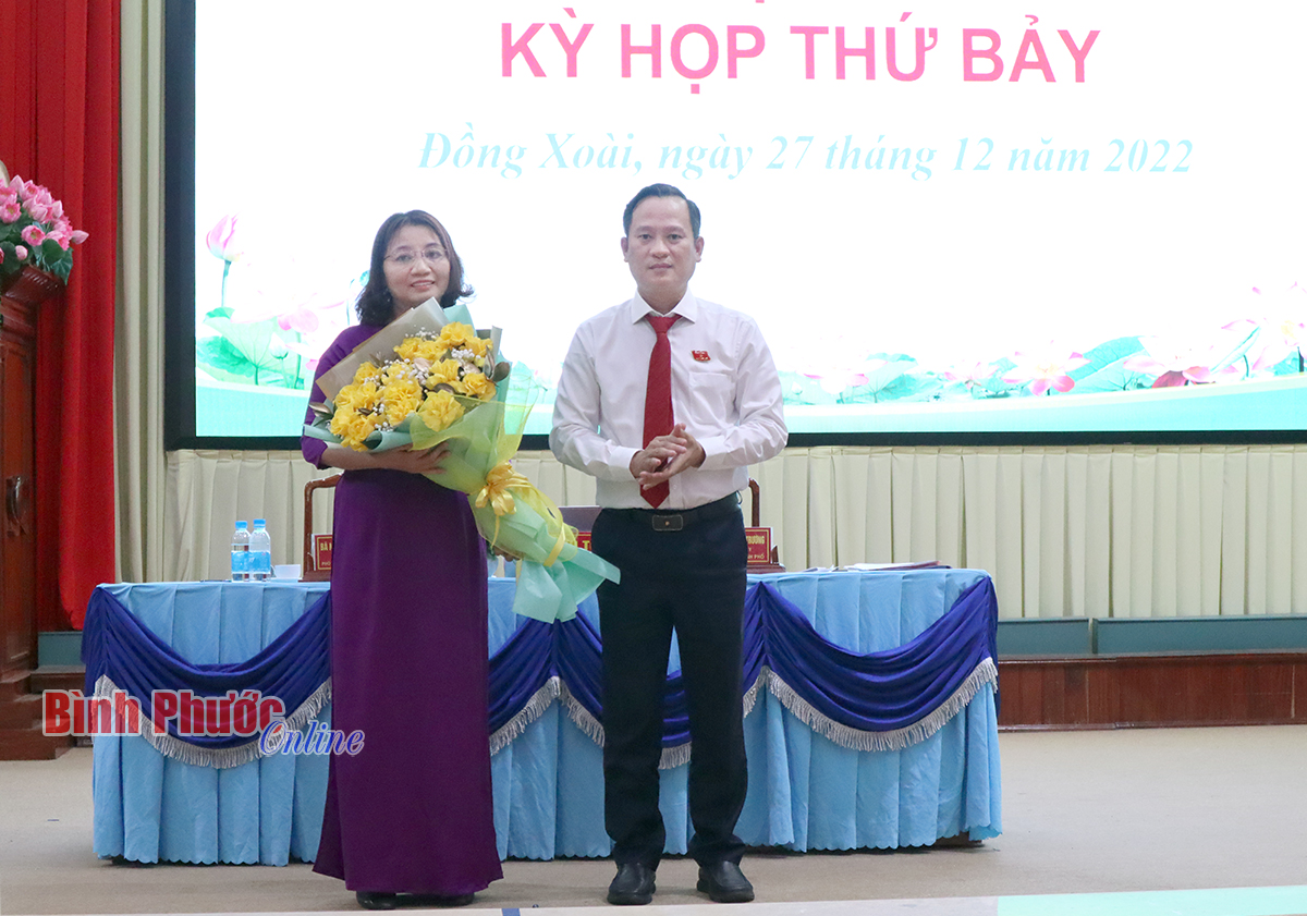 Chủ tịch UBND thành phố Đồng Xoài Nguyễn Minh Bình tặng hoa chúc mừng bà Võ Thị Ái, Trưởng phòng Lao động, Thương binh và Xã hội thành phố vừa được HĐND thành phố bầu bổ sung Ủy viên UBND thành phố khóa V, nhiệm kỳ 2021-2026