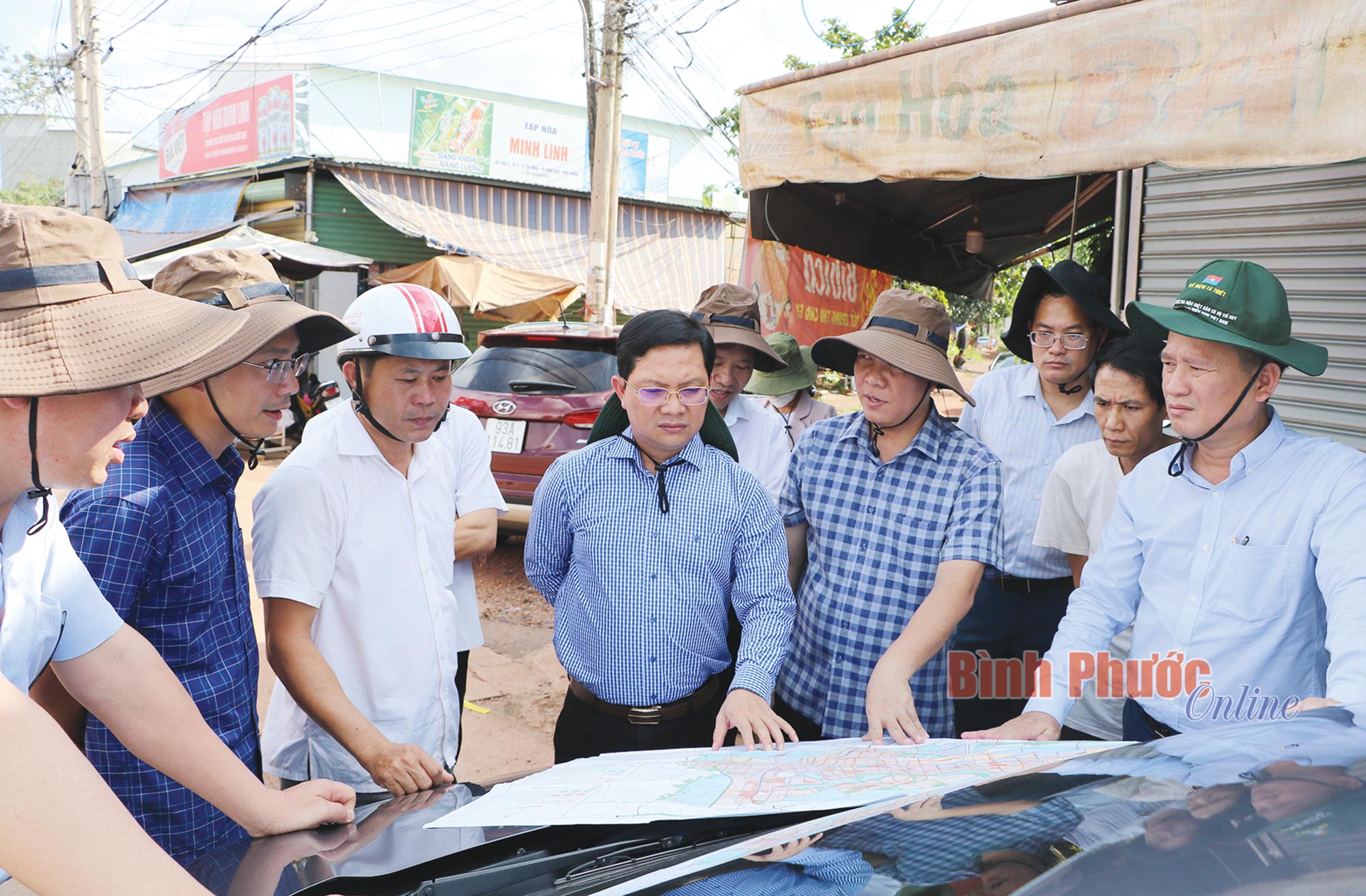 Bí thư Thành ủy Đồng Xoài Hà Anh Dũng kiểm tra thực địa triển khai dự án đường Nguyễn Huệ nối dài đoạn qua phường Tân Đồng kết nối với ĐT741