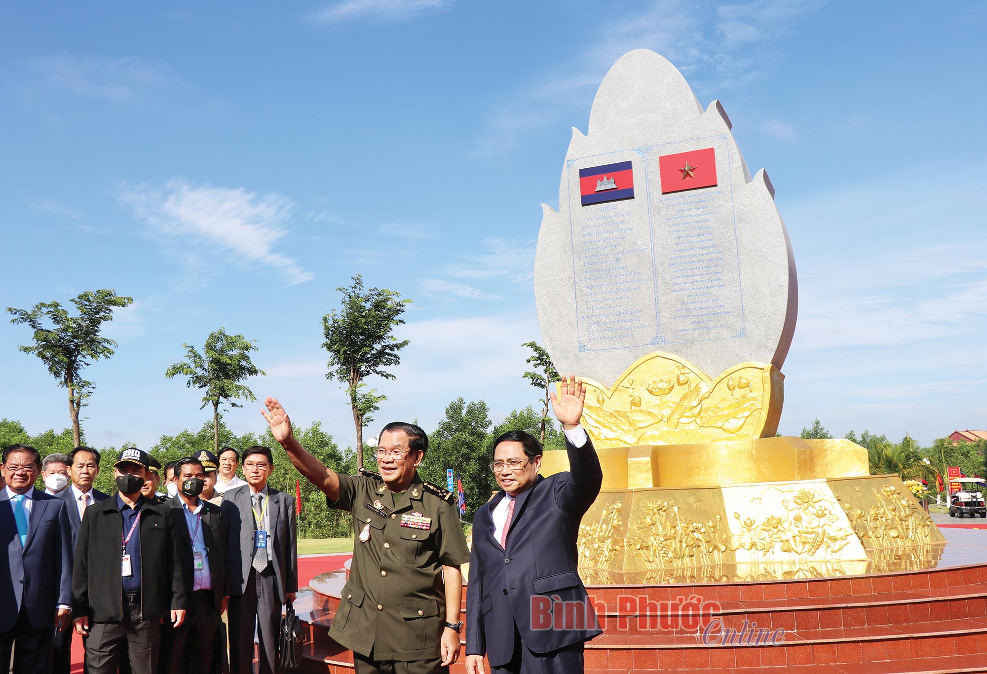Thủ tướng Chính phủ Phạm Minh Chính và Thủ tướng Hun Sen tại sự kiện kỷ niệm “45 năm con đường tiến tới đánh đổ chế độ diệt chủng Pol Pot” của Thủ tướng Campuchia Hun Sen ở Cụm công trình X16, huyện Lộc Ninh - Ảnh: Thanh Mảng