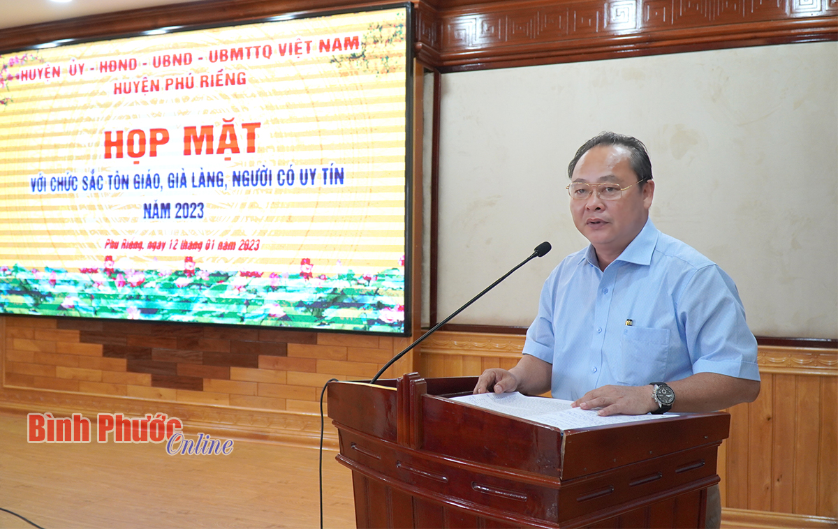 Phát biểu tại buổi họp mặt, Phó Bí thư Thường trực Huyện ủy Nguyễn Quốc Soài mong muốn và tin tưởng các chức sắc tôn giáo, già làng, người có uy tín trên địa bàn huyện tiếp tục đoàn kết, gắn bó, hợp tác chặt chẽ với các cấp chính quyền, ban, ngành, MTTQ và các đoàn thể chính trị xã hội, góp phần củng cố, tăng cường khối đại đoàn kết toàn dân và thực hiện thắng lợi các chỉ tiêu, nhiệm vụ phát triển kinh tế - xã hội năm 2023.