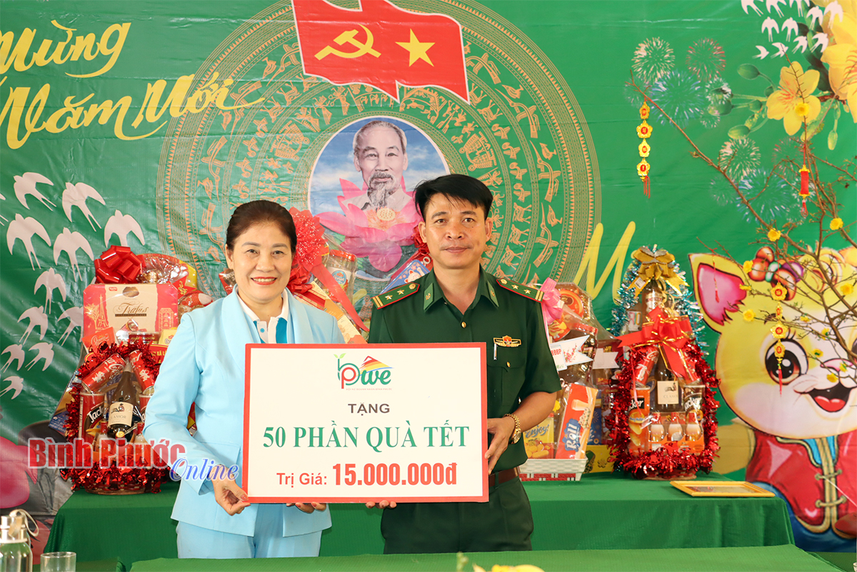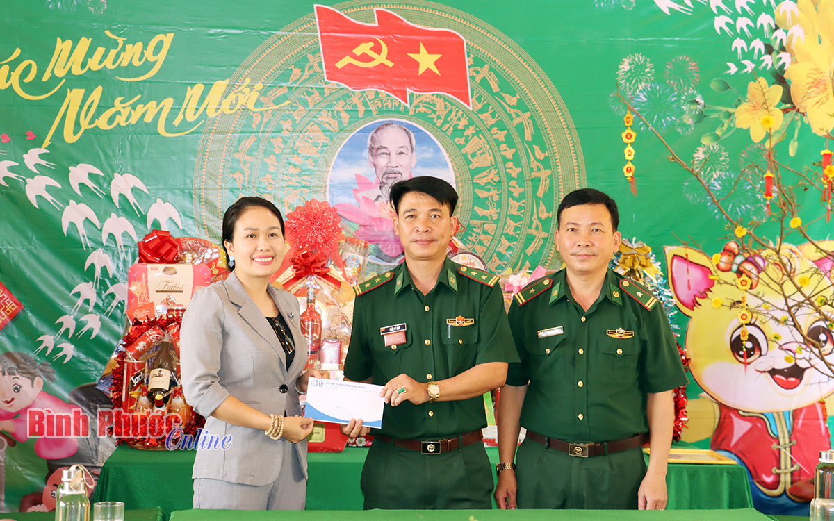 Chủ tịch Hội Nữ doanh nhân tỉnh Bình Phước Giang Thị Lan Thu tặng quà chúc tết Đồn biên phòng Tân Thành, huyện Bù Đốp
