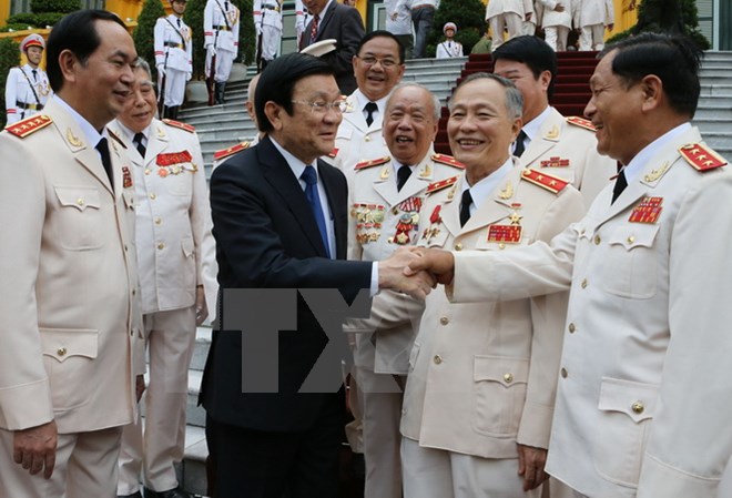 Vui mừng gặp mặt đại diện các thế hệ Tướng lĩnh Công an Nhân dân, Chủ tịch nước Trương Tấn Sang cho rằng, trong những thành tựu to lớn của lực lượng Công an Nhân dân 70 năm qua, có sự đóng góp xứng đáng của các thế hệ Tướng lĩnh - những sỹ quan chỉ huy cao cấp của lực lượng Công an Nhân dân, những người được tôi luyện, trưởng thành từ thực tiễn công tác, chiến đấu, có bản lĩnh chính trị vững vàng, kiên cường, dũng cảm, là những tấm gương tiêu biểu về tinh thần yêu nước, hết lòng phụng sự Tổ quốc, phụng sự nhân dân, sẵn sàng chiến đấu hy sinh vì sự nghiệp Cách mạng của dân tộc.