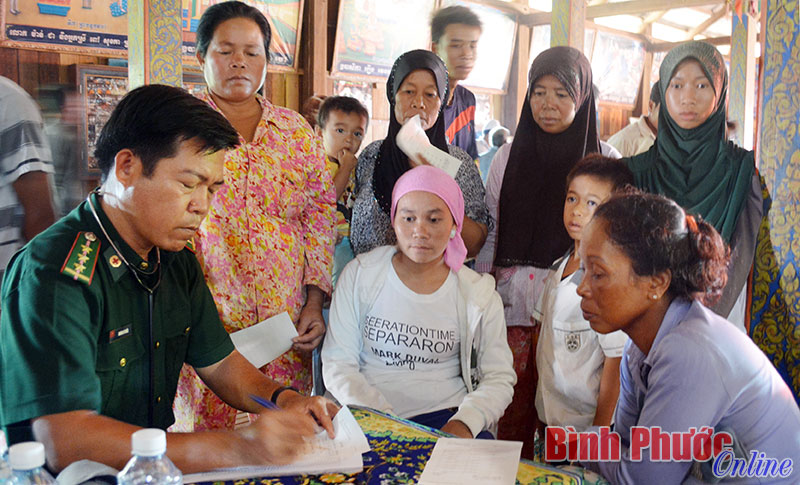 Cán bộ quân y Bộ đội biên phòng tỉnh khám bệnh và phát thuốc cho đồng bào xã SRekhTum, huyện Kaev Seima, tỉnh Mundulkiri, Vương quốc Campuchia