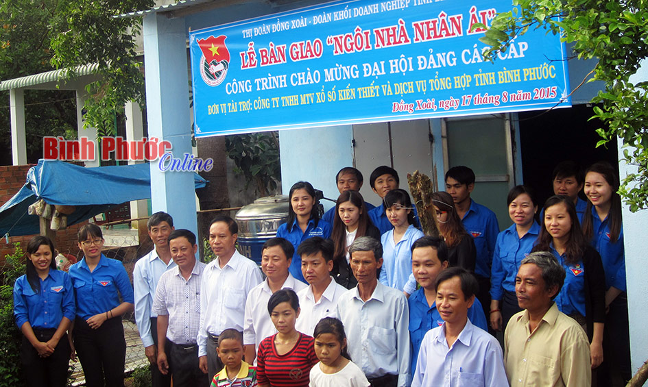 BPO - * Ngày 17-8, Thị đoàn Đồng Xoài phối hợp Đoàn khối doanh nghiệp tỉnh, Công ty TNHH MTV Xổ số kiến thiết và Dịch vụ tổng hợp Bình Phước tổ chức lễ bàn giao ngôi nhà nhân ái cho đoàn viên Nguyễn Thị Hải, Chi đoàn khu phố Phước An, phường Tân Xuân, thị xã Đồng Xoài.