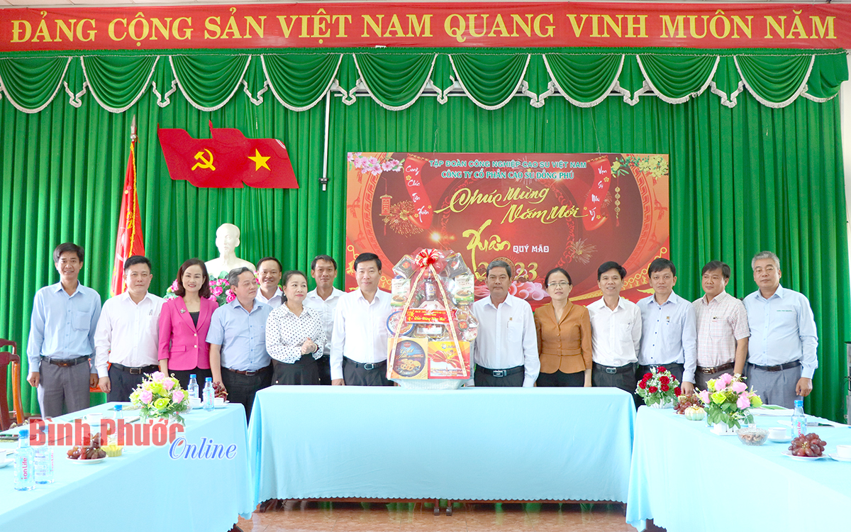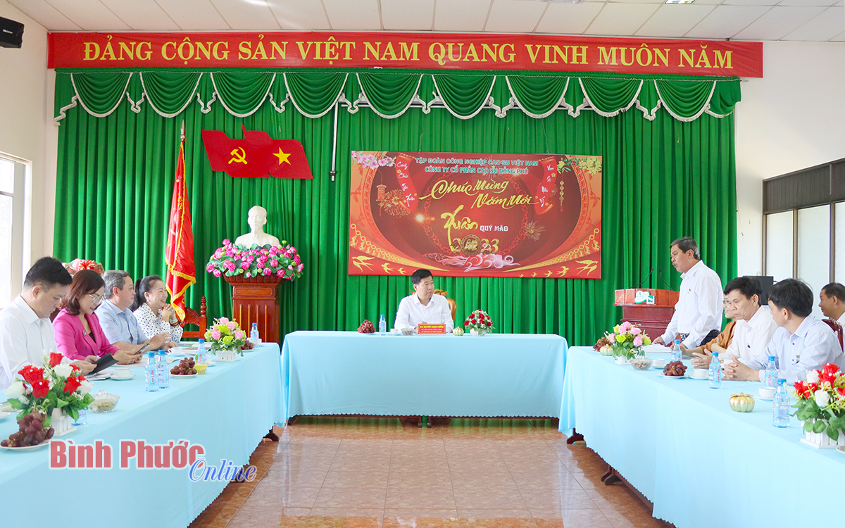 Báo cáo với Bí thư Tỉnh ủy, thay mặt Đảng ủy, lãnh đạo công ty, ông Hồ Cường, Bí thư Đảng ủy, Tổng Giám đốc Công ty cổ phần cao su Đồng Phú cho biết: Công ty hiện có 6 nông trường, 2 nhà máy chế biến, 1 chi nhánh gỗ, 1 bệnh viện đa khoa, 4 công ty trực thuộc. Trong đó, có 2 công ty hoạt động trong lĩnh vực công nghiệp (Công ty cổ phần Khu công nghiệp Bắc Đồng Phú và Công ty cổ phần Cao su kỹ thuật Đồng Phú) và 2 công ty hoạt động trong lĩnh vực nông nghiệp tại tỉnh Đắk Nông và Vương quốc Campuchia. Hiện nay, Đảng bộ Công ty cổ phần cao su Đồng Phú có 13 chi, đảng bộ cơ sở với trên 400 đảng viên (chiếm 17,4% tổng số cán bộ, công nhân viên công ty). Năm 2022, thu nhập bình quân đầu người đạt 11,2 triệu đồng/tháng. Bên cạnh thực hiện nhiệm vụ sản xuất, kinh doanh, công ty luôn quan tâm đến việc chăm lo cho người lao động. Trong năm 2022, công ty đã có các chính sách hỗ trợ người lao động ngoài quy định của luật như: hỗ trợ bữa ăn giữa ca (10,8 tỷ đồng), tổ chức cho cán bộ, công nhân viên, người lao động đi du lịch (5,1 tỷ đồng), hỗ trợ xây dựng nhà mới hoặc sửa chữa nhà (8 căn, trị giá 380 triệu đồng). Đặc biệt, nhân dịp tết Nguyên đán Quý Mão 2023, công ty đã tặng quà cho 100% cán bộ, công nhân, lao động trong toàn công ty với trị giá 2,5 tỷ đồng. Công đoàn công ty đã tổ chức 7 chuyến xe chở 310 công nhân, lao động là người đồng bào dân tộc thiểu số ở tỉnh Nghệ An về quê ăn tết, toàn bộ chi phí do công ty hỗ trợ.