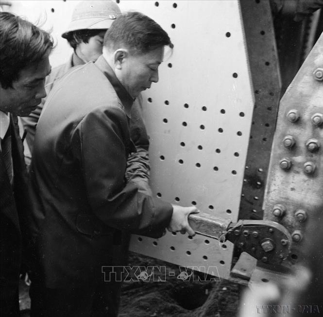 Bộ trưởng Bộ Giao thông vận tải Đồng Sỹ Nguyên xiết bu-lông tượng trưng tại Lễ nối liền dầm cầu Chương Dương (Hà Nội), ngày 17-2-1985. Thời gian đó, ông là người kiên quyết bảo vệ phương án phải xây dựng cầu Chương Dương khi chúng ta định chỉ làm duy nhất cầu Thăng Long bắc qua sông Hồng tại địa bàn Thủ đô. Ảnh: Bảo Hanh/TTXVN