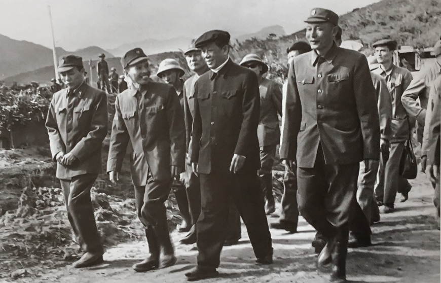 Tư lệnh Đồng Sỹ Nguyên (hàng đầu, bên phải) tháp tùng đồng chí Lê Duẩn, Bí thư thứ nhất Ban Chấp hành Trung ương Đảng, thăm Bộ đội Trường Sơn năm 1973. Ảnh tư liệu