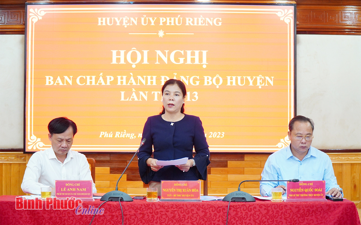 Kết luận hội nghị, Bí thư Huyện ủy Nguyễn Thị Xuân Hòa đề nghị cấp ủy, chính quyền các cấp trong huyện: Tập trung thực hiện các nhiệm vụ phát triển kinh tế - xã hội, quyết liệt các giải pháp trong thu ngân sách; ưu tiên các nhiệm vụ trọng tâm, các công trình trọng điểm; triển khai các mô hình hợp tác xã, sản phẩm đạt tiêu chuẩn OCOP; công tác xây dựng huyện Phú Riềng đạt nông thôn mới; tập trung tháo gỡ những vướng mắc về giải phóng mặt bằng. Đồng thời, rà soát, phê duyệt nguồn quy hoạch các chức danh lãnh đạo thuộc diện Ban Thường vụ Huyện ủy quản lý; làm tốt công tác phát triển đảng viên; tạo nguồn đào tạo, bồi dưỡng cán bộ; chú trọng công tác kiểm tra, giám sát các lĩnh vực nhạy cảm dễ phát sinh sai phạm…