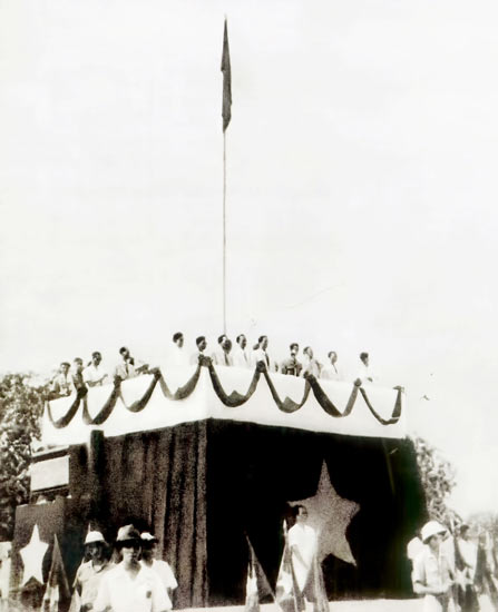 Đó là nữ du kích Đàm Thị Loan, khi ấy vừa tròn 20 tuổi (sau này là phu nhân của Đại tướng Hoàng Văn Thái) và nữ sinh Dương Lệ Thi, hội viên Hội Phụ nữ cứu quốc Hà Nội, 19 tuổi, con của học giả Dương Quảng Hàm. Vào ngày 2-9-1945, trước nửa triệu đồng bào dự mít tinh, hai người phụ nữ ấy đã được vinh dự kéo quốc kỳ lên cột cờ khán đài Ba Đình, nơi Bác Hồ đọc bản Tuyên ngôn Độc lập, thành lập nước Việt Nam Dân chủ Cộng hòa, nhà nước độc lập của dân tộc sau 80 năm đấu tranh anh dũng, lật đổ ách thống trị của bọn phát xít, thực dân, phong kiến trên đất nước ta.