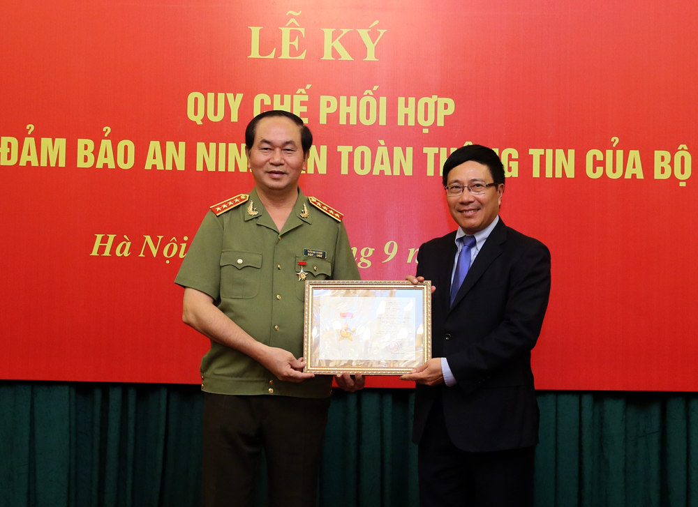 Phó Thủ tướng Phạm Bình Minh và Bộ trưởng Bộ Công an Trần Đại Quang ký Quy chế phối hợp về tăng cường đảm bảo an ninh, an toàn thông tin của Bộ Ngoại giao