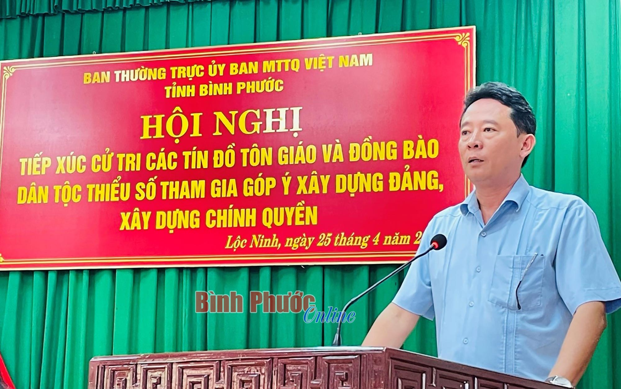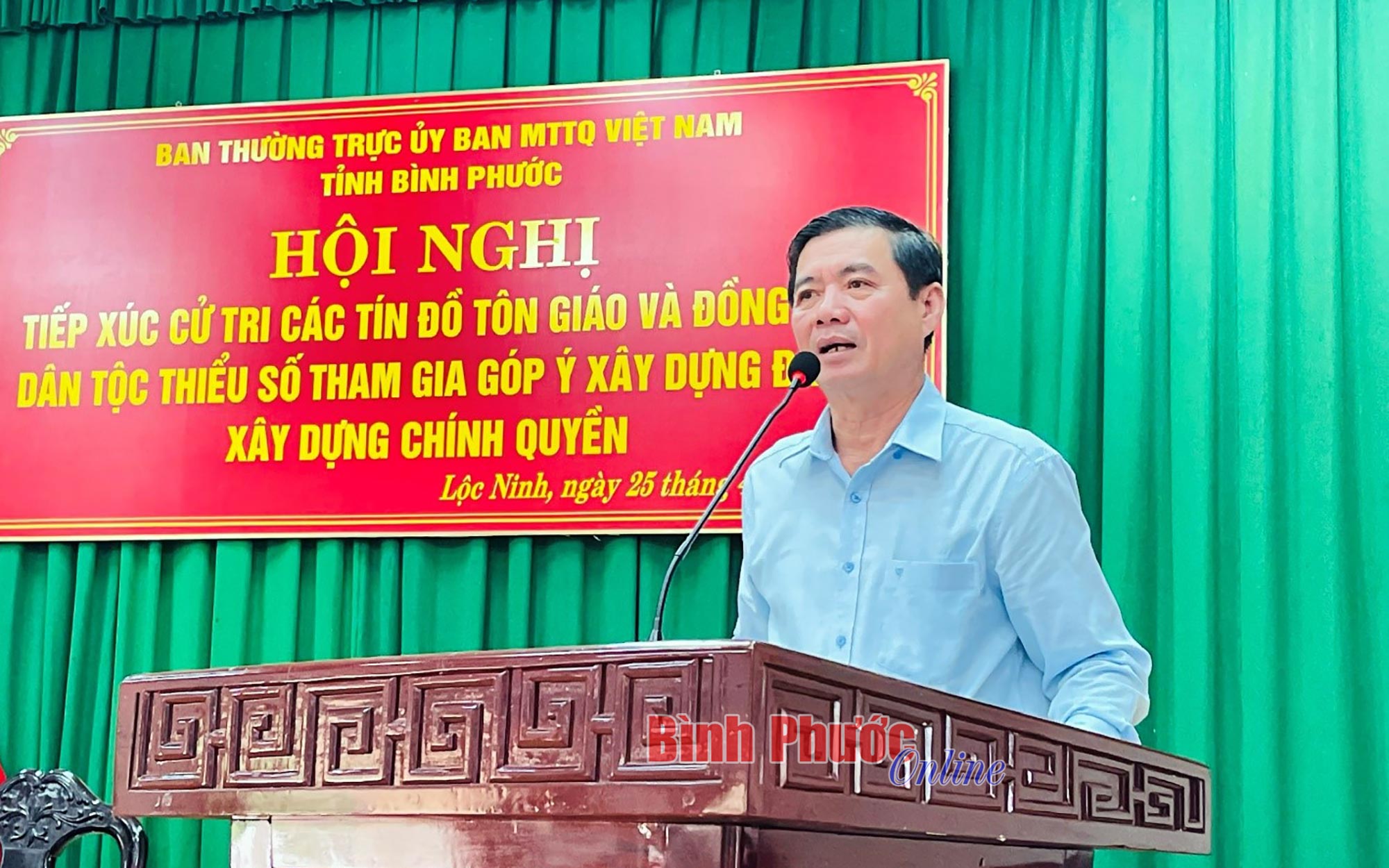 Tham dự hội nghị có Tỉnh ủy viên, Phó trưởng đoàn chuyên trách, phụ trách Đoàn đại biểu Quốc hội tỉnh Điểu Huỳnh Sang; Tỉnh ủy viên, Trưởng ban Pháp chế HĐND tỉnh Vũ Long Sơn; Phó Giám đốc Sở Nội vụ Phạm Thành Chung cùng đại diện lãnh đạo các sở, ban, ngành của tỉnh; lãnh đạo địa phương và gần 200 cử tri các tôn giáo, đồng bào dân tộc thiểu số trên địa bàn huyện Lộc Ninh.