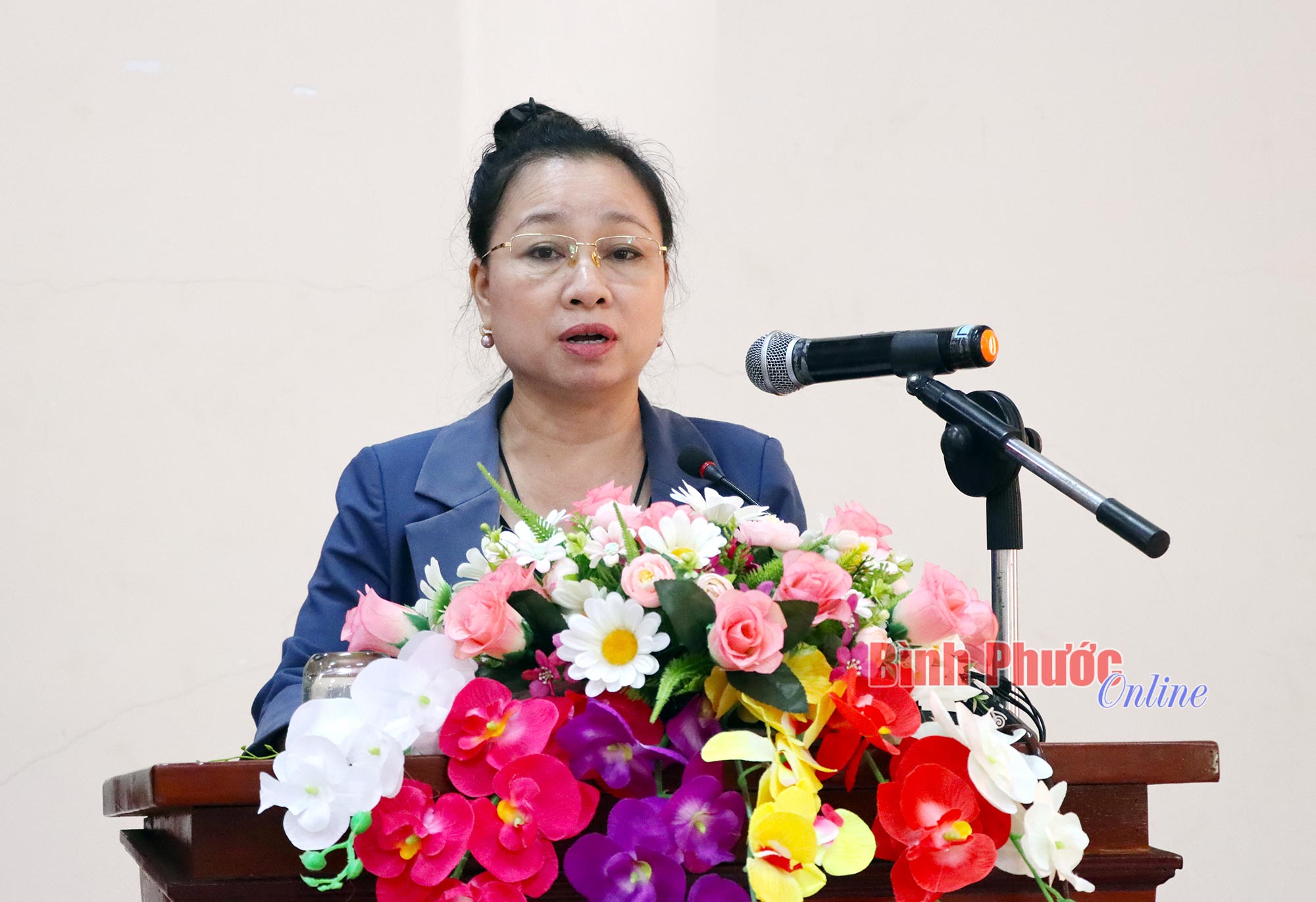 Ủy viên Ban Thường vụ, Trưởng ban Dân vận Tỉnh ủy, Chủ tịch UBMTTQVN tỉnh Lê Thị Xuân Trang phát biểu tại hội nghị