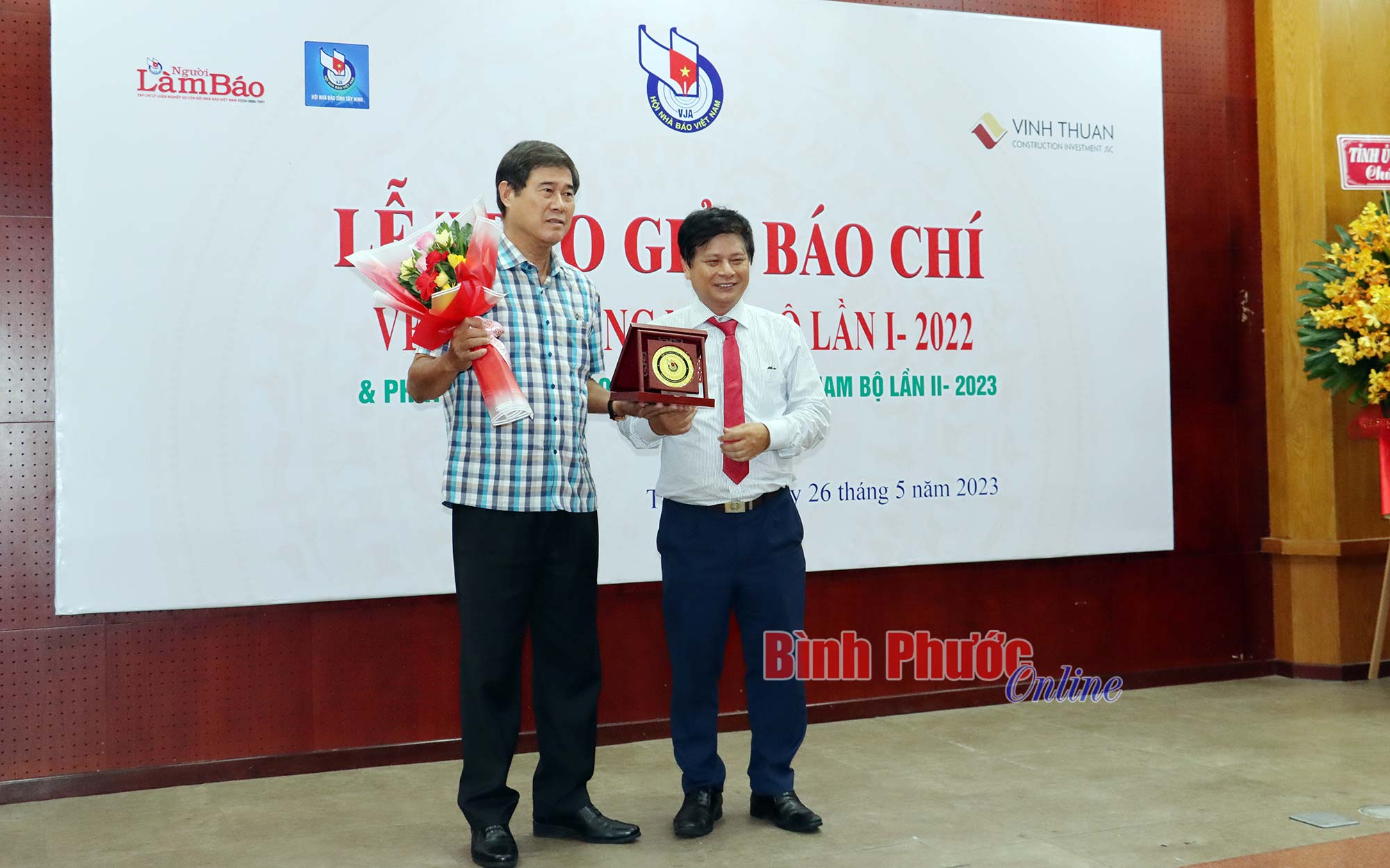 Đại diện Ban tổ chức trao chứng nhận và cúp cho 2 tác phẩm đoạt giải nhì của đơn vị Đài Phát thanh - Truyền hình và Báo Bình Phước
