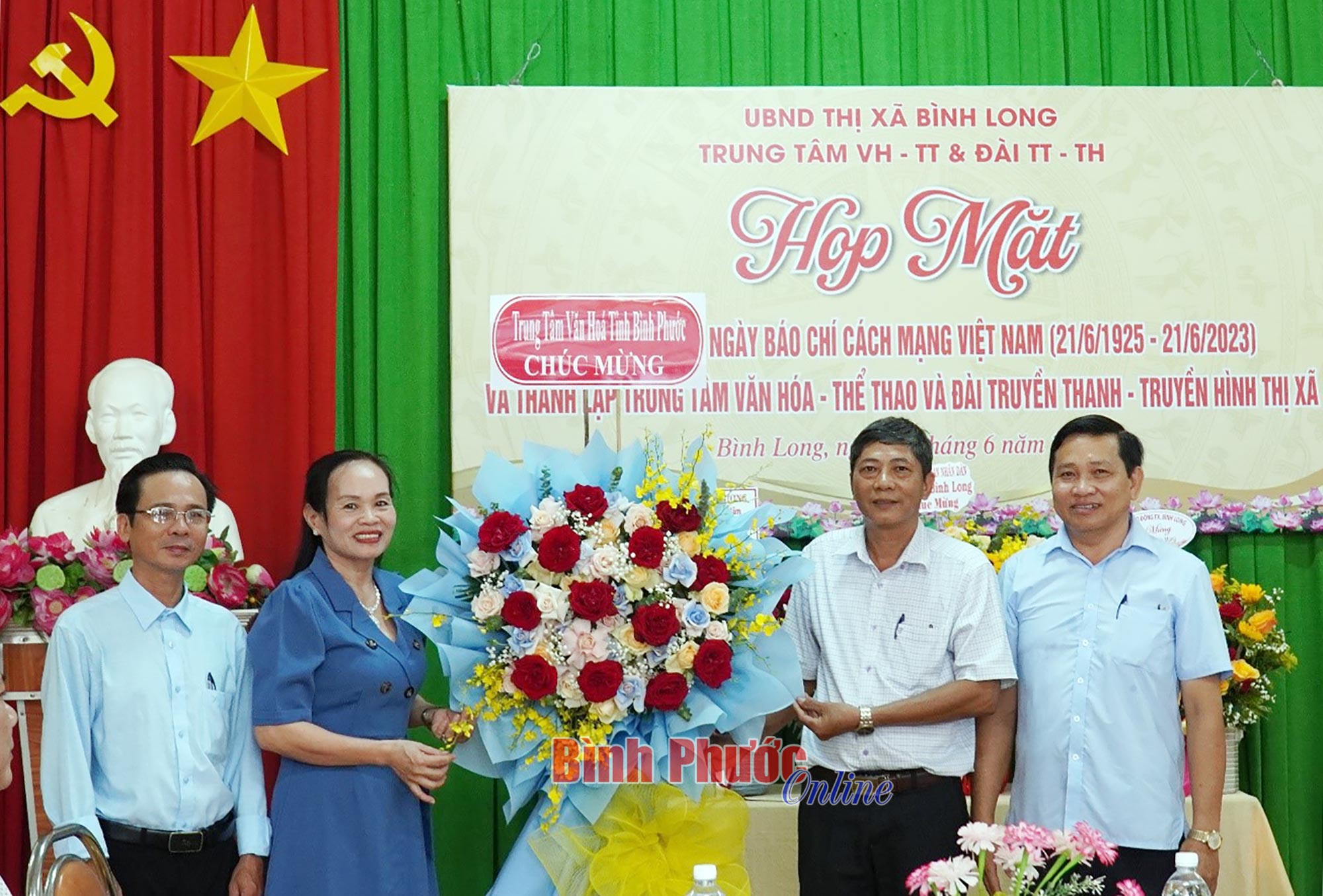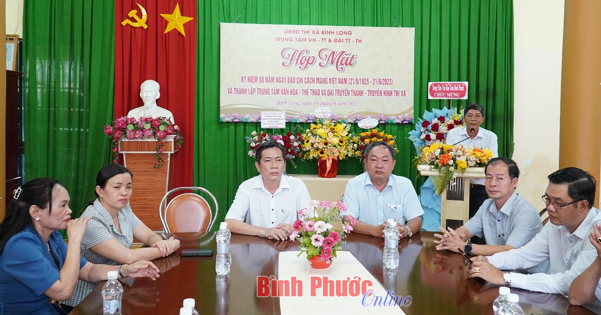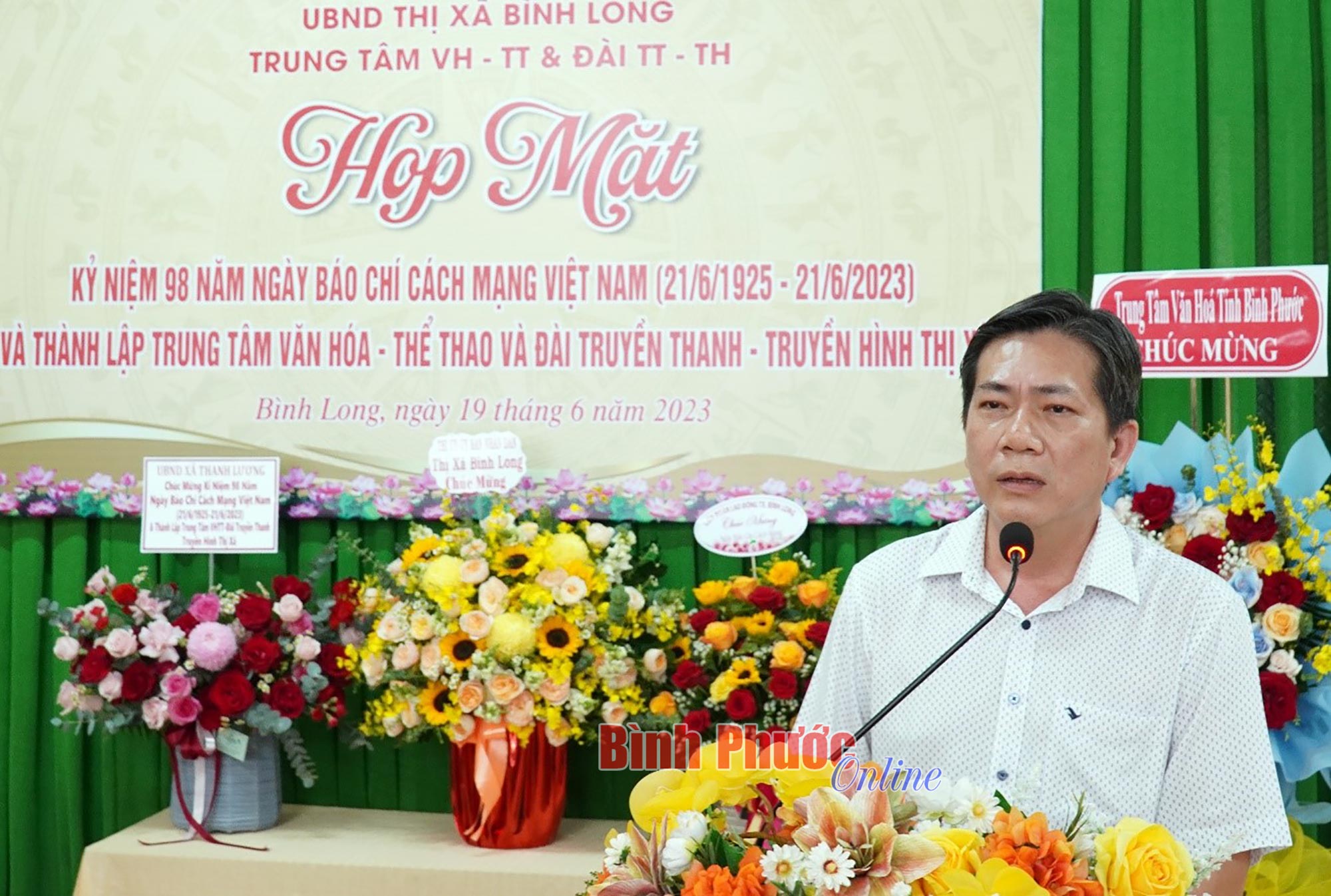 Phát biểu chúc mừng tại buổi họp mặt, Tỉnh ủy viên, Bí thư Thị ủy Bình Long Bùi Quốc Bảo ghi nhận những đóng góp của đội ngũ cán bộ, công chức, viên chức Trung tâm Văn hóa - Thể thao và Đài TT-TH thị xã trong việc tuyên truyền các chủ trương, đường lối của Đảng, chính sách, pháp luật của Nhà nước. Đặc biệt, trong công tác phòng, chống dịch Covid-19. Cùng với lực lượng làm nhiệm vụ tuyến đầu phòng, chống dịch, đội ngũ phóng viên của bộ phận Đài TT-TH thị xã đã kịp thời ghi nhận, phản ánh những thông tin chính xác về tình hình dịch bệnh, cũng như biện pháp phòng, chống dịch để nhân dân yên tâm, chung tay cùng địa phương đẩy lùi dịch bệnh.