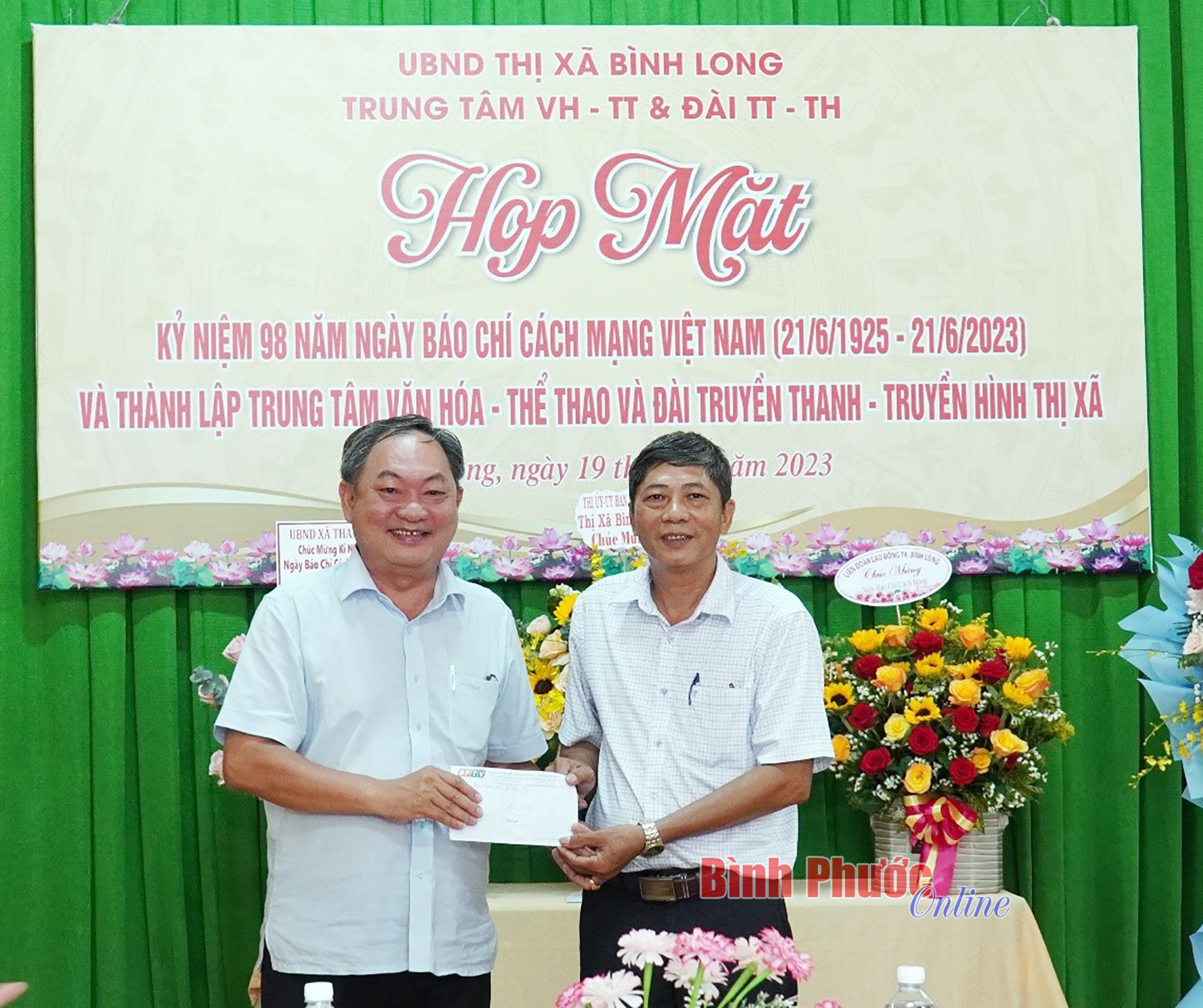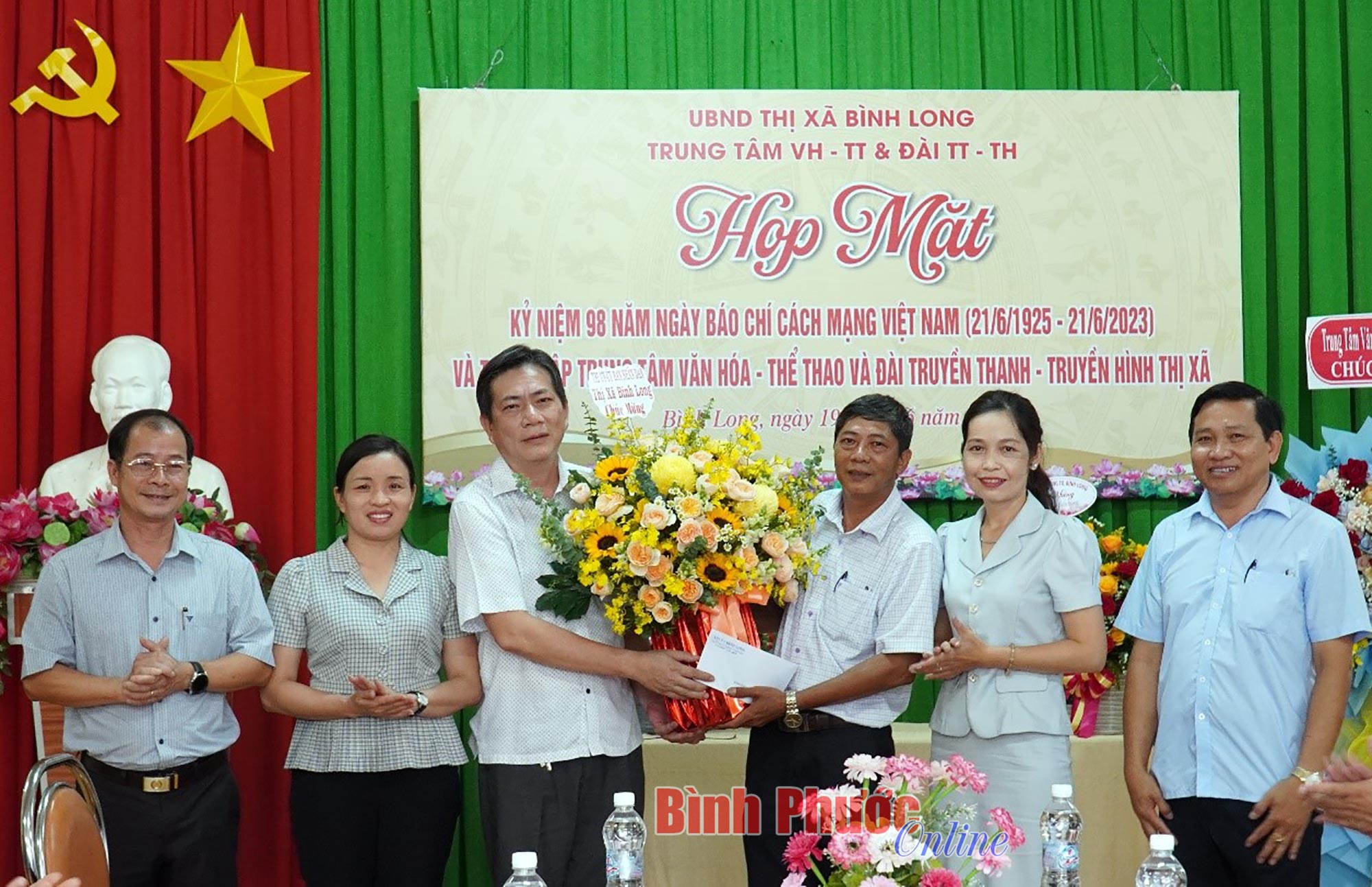 Nhân kỷ niệm 98 năm Ngày báo chí cách mạng Việt Nam, lãnh đạo thị xã Bình Long chúc mừng đội ngũ cán bộ, công chức, viên chức bộ phận Đài TT-TH thị xã ngày lễ thật ý nghĩa, nhiều sức khỏe, tiếp tục thực hiện tốt nhiệm vụ chuyên môn, góp phần đưa các nghị quyết của Đảng, chính sách, pháp luật của Nhà nước nhanh nhất đến người dân.