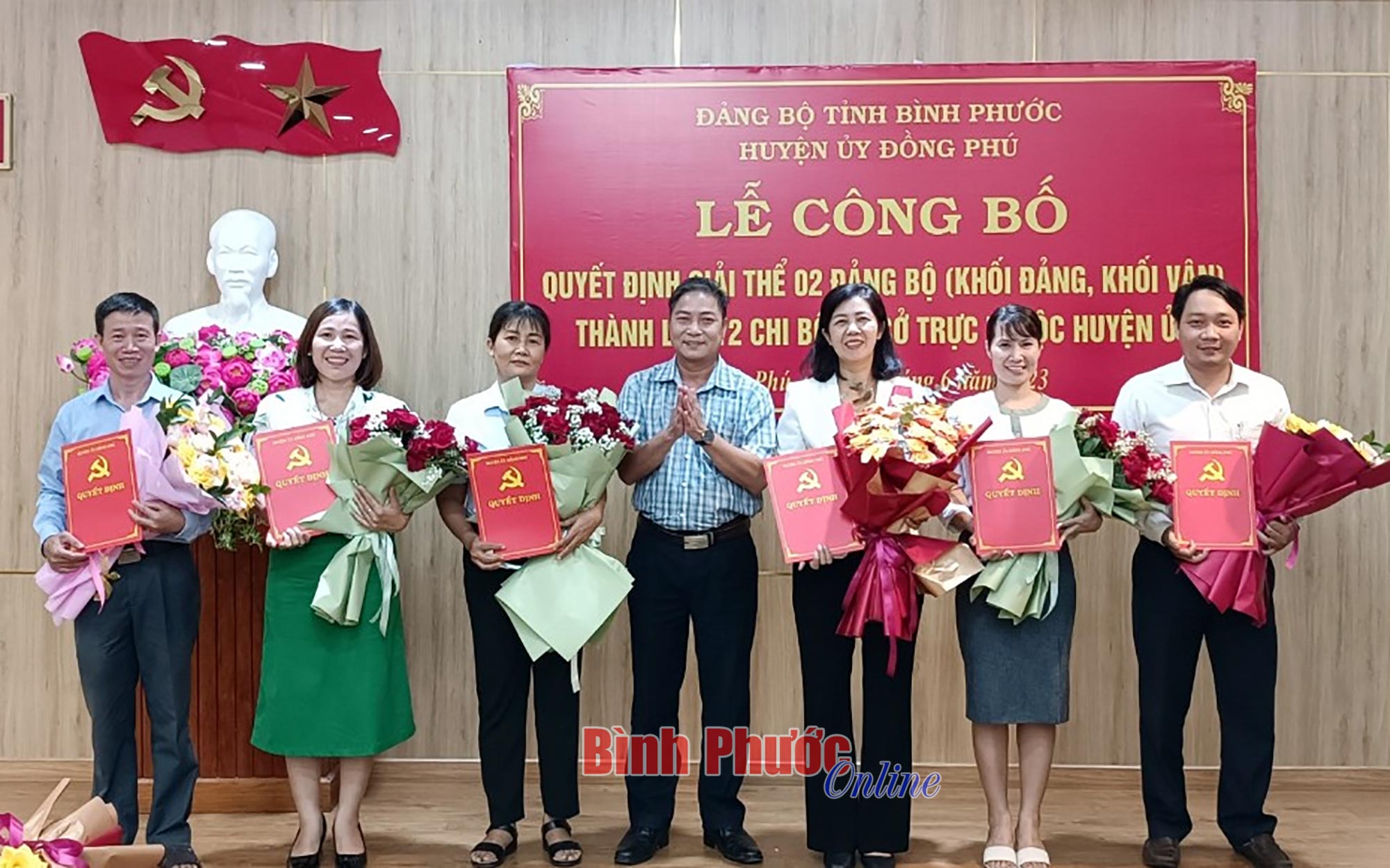 2 đảng bộ giải thể là Đảng bộ cơ quan Khối đảng và Khối vận. 12 chi bộ trực thuộc Huyện ủy được thành lập gồm: Ủy ban Kiểm tra, Ban Tuyên giáo, Ban Tổ chức, Ban Dân vận, Văn phòng Huyện ủy, Hội Chữ thập đỏ, Hội Cựu chiến binh, Huyện đoàn, Hội Phụ nữ, Hội Nông dân, Liên đoàn Lao động, Mặt trận Tổ quốc.