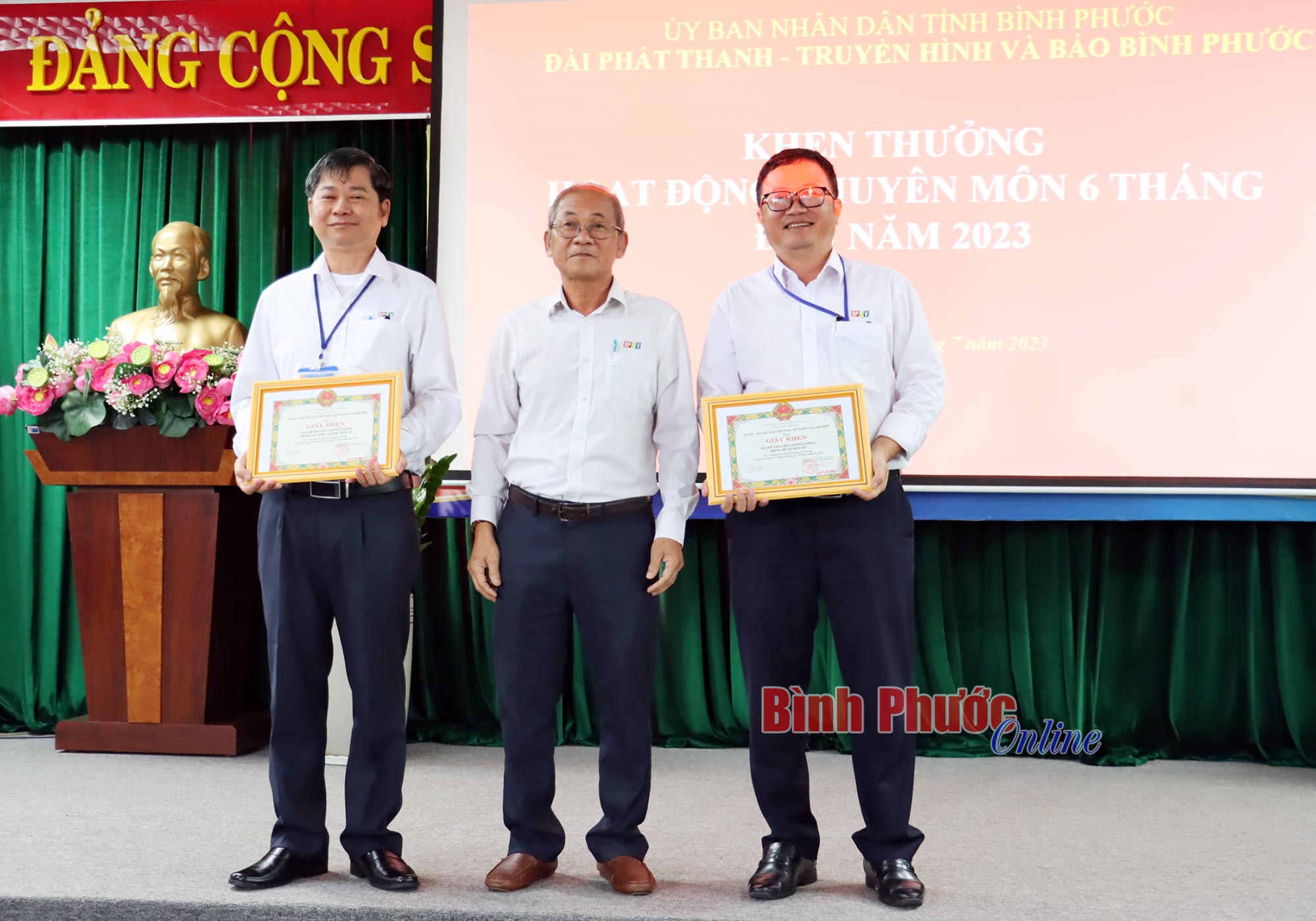 Phó Giám đốc - Phó Tổng biên tập Phan Văn Thảo trao giấy khen cho đại diện hai tập thể có thành tích xuất sắc trong 6 tháng đầu năm 2023