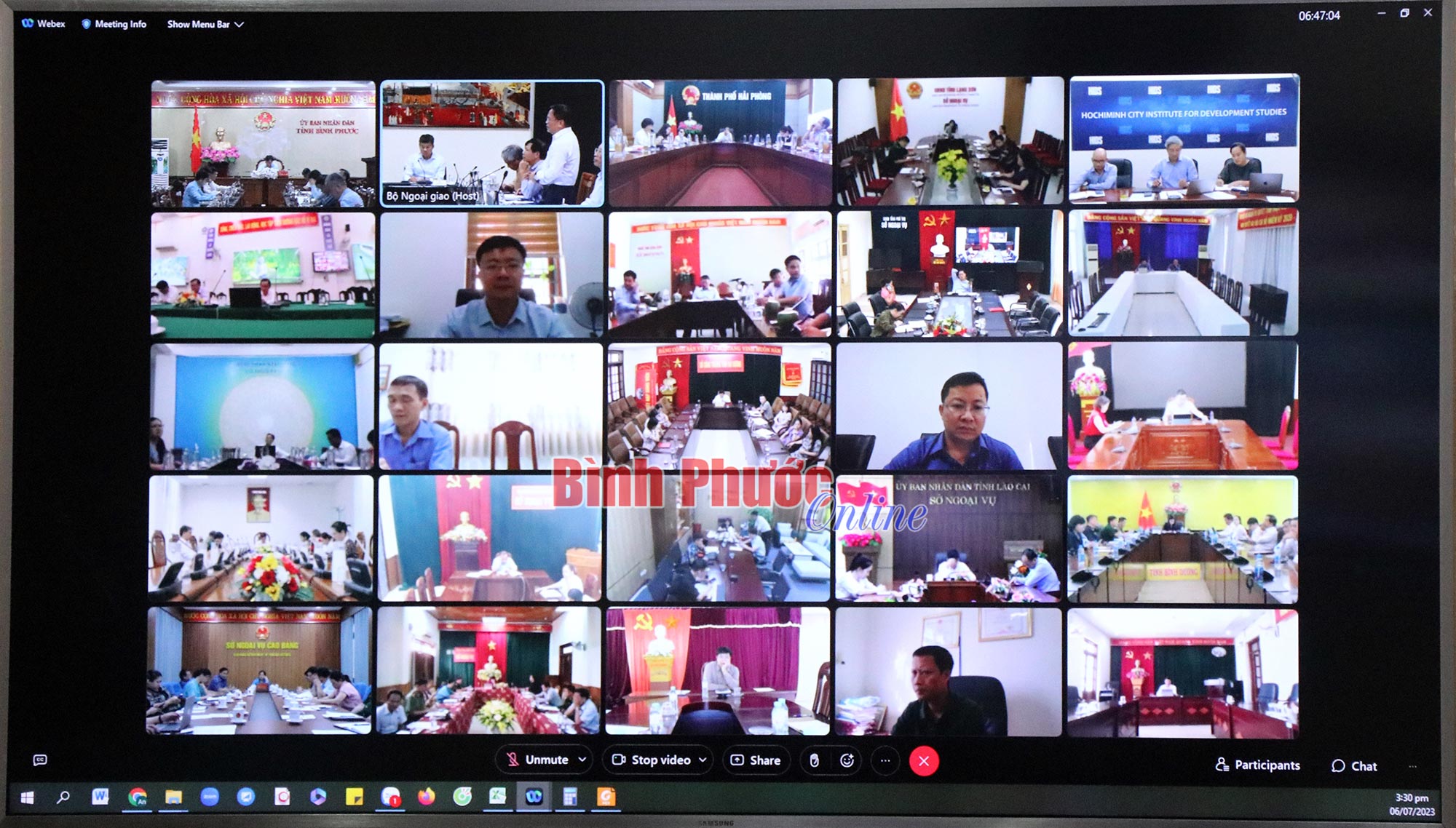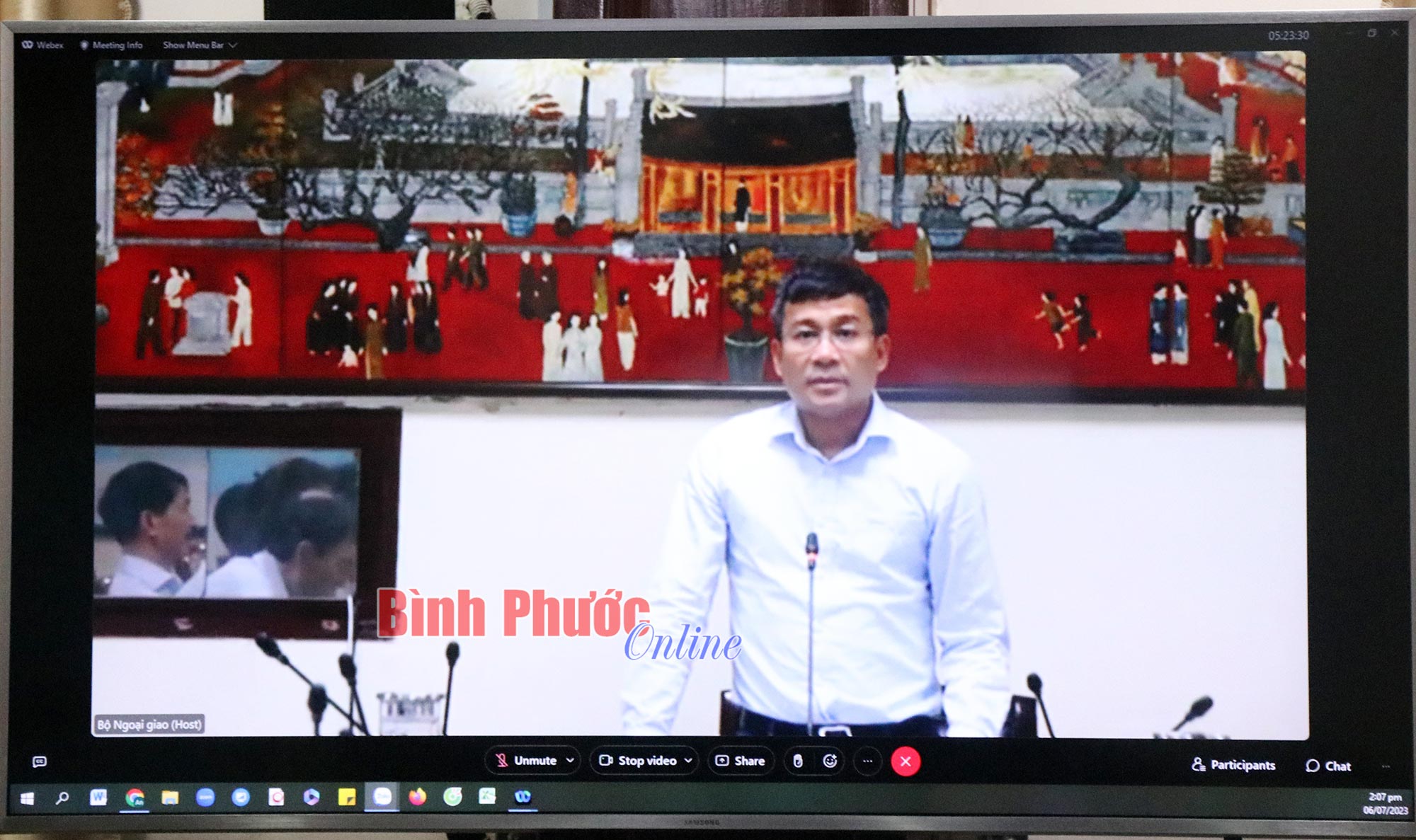 Chiều 6-7, Bộ Ngoại giao tổ chức tọa đàm trực tuyến với chủ đề “10 năm tích cực, chủ động hội nhập quốc tế của các địa phương: những vấn đề đặt ra và phương hướng thời gian tới”. Thứ trưởng Thường trực Bộ Ngoại giao Nguyễn Minh Vũ chủ trì buổi tọa đàm. Dự buổi tọa đàm tại điểm cầu tỉnh Bình Phước có Phó Chủ tịch UBND tỉnh Trần Văn Mi và các thành viên Ban Hội nhập kinh tế quốc tế tỉnh.