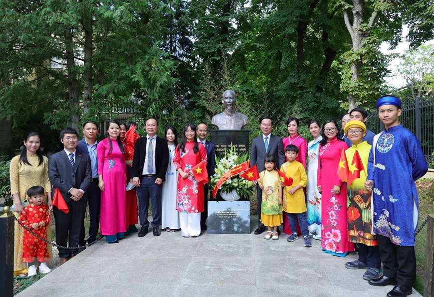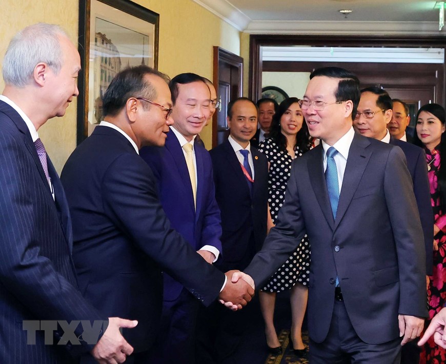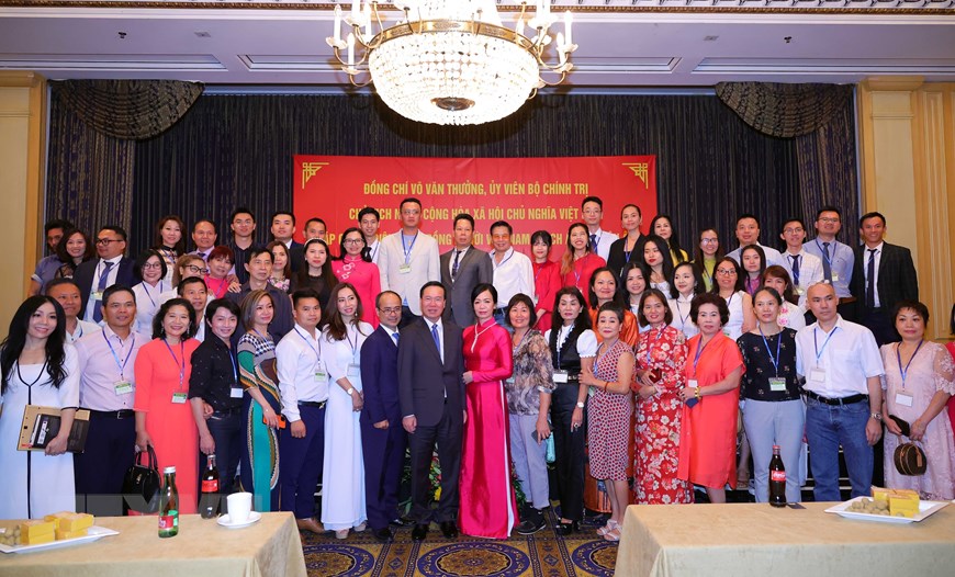 Chủ tịch nước Võ Văn Thưởng và Phu nhân gặp gỡ đại diện cộng đồng Việt Nam tại Áo và châu Âu, chiều 23-7-2023 (theo giờ địa phương). (Ảnh: Thống Nhất/TTXVN)