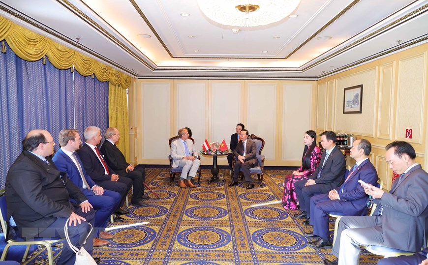 Tiếp tục chuyến thăm chính thức Cộng hòa Áo, chiều 23-7-2023 (theo giờ địa phương), tại Thủ đô Vienna, Chủ tịch nước Võ Văn Thưởng tiếp Chủ tịch Hội Hữu nghị Áo-Việt Nam Alfred Gerstl và một số bạn bè người Áo. (Ảnh: Thống Nhất/TTXVN)