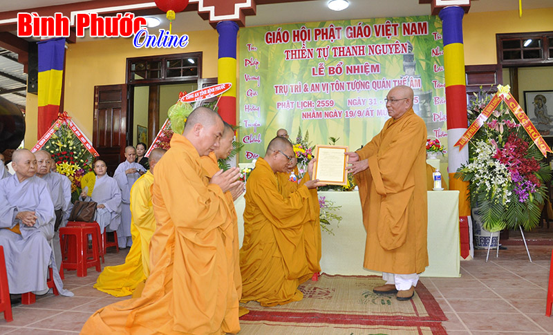 Trưởng ban trị sự Giáo hội Phật giáo Việt Nam tỉnh Bình Phước, Hòa thượng Thích Nhuận Thanh trao quyết định bổ nhiệm trụ trì cho Đại đức Thích Thông Lý
