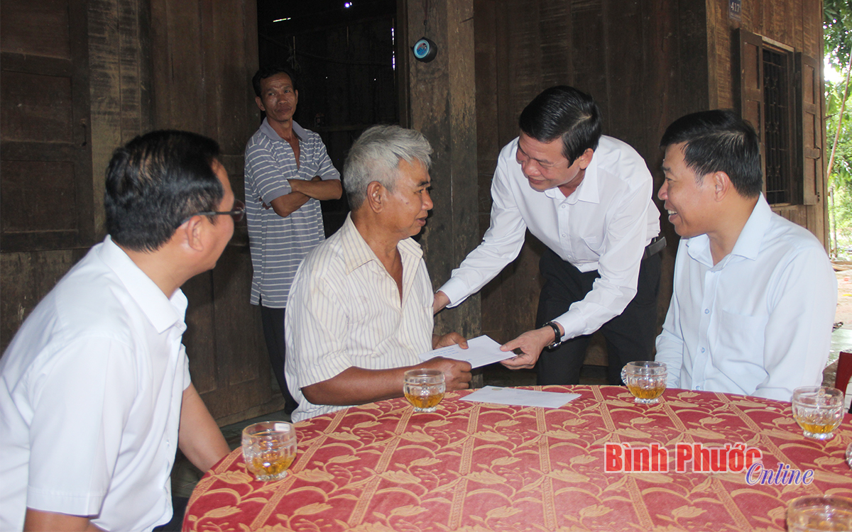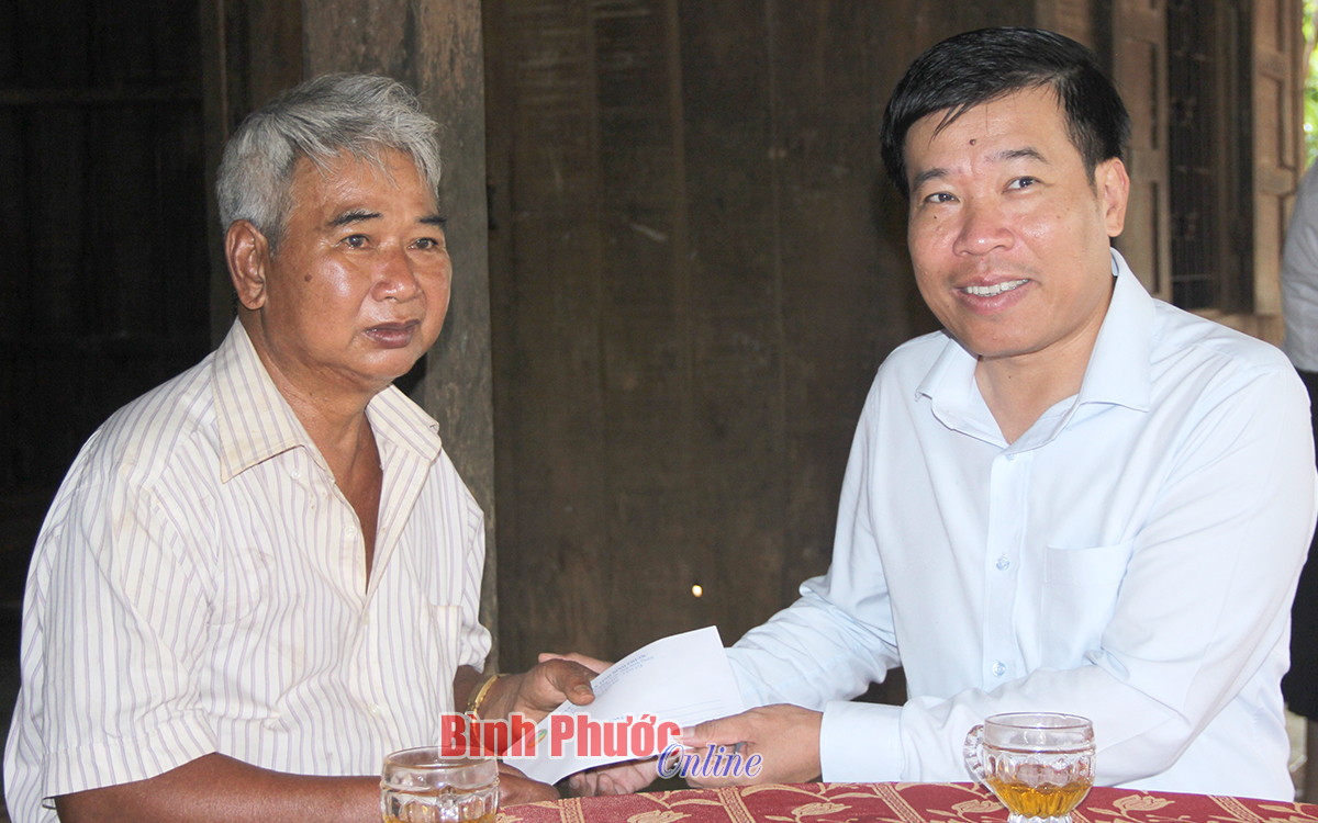 Ủy viên Trung ương Đảng, Bí thư Tỉnh ủy Nguyễn Mạnh Cường và Bí thư Huyện ủy Bù Đăng Vũ Lương tặng quà cho thương binh Điểu Văn Son ở xã Bình Minh