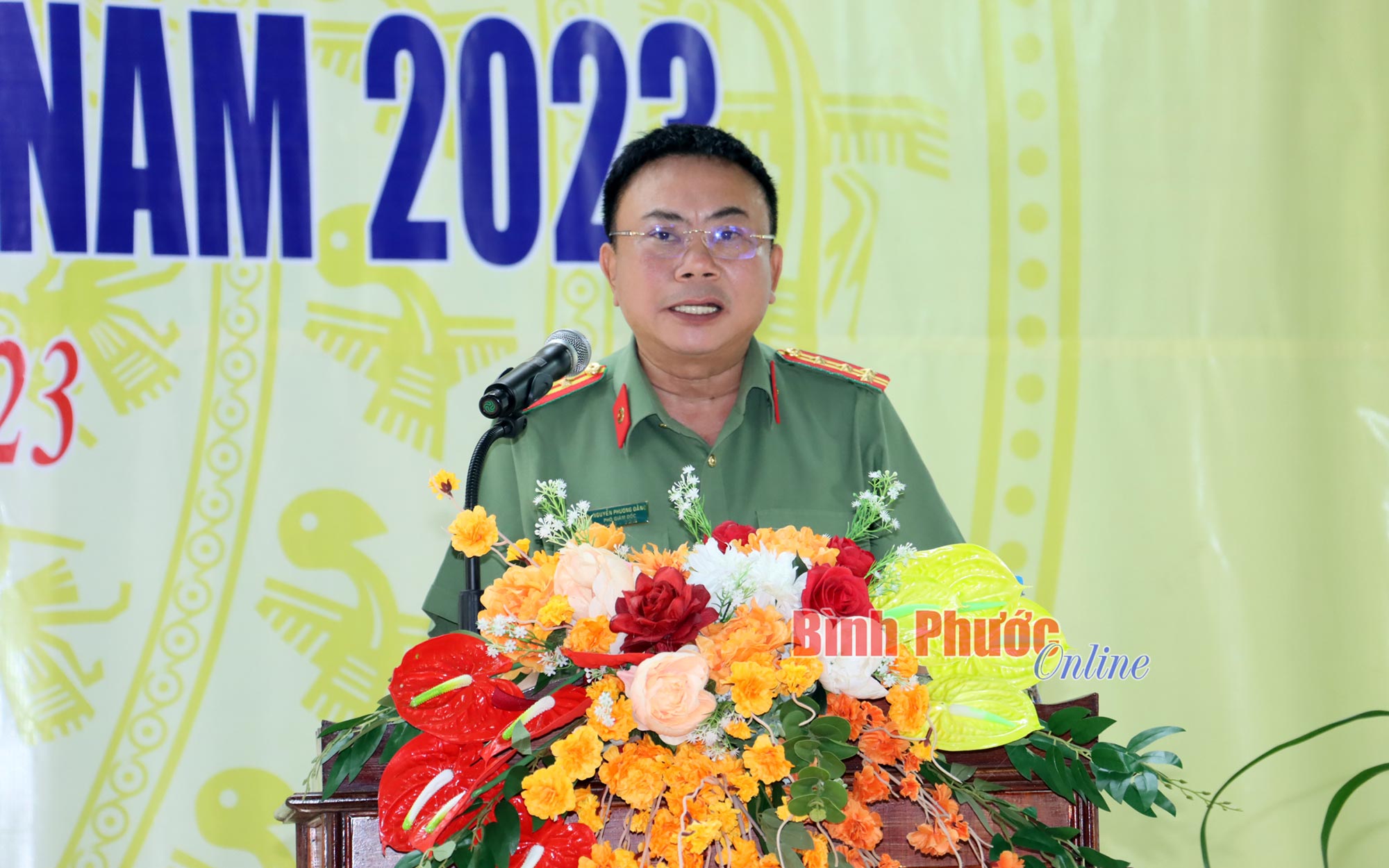 Đại tá Nguyễn Phương Đằng, Phó Giám đốc Công an tỉnh, Phó ban Chỉ đạo phòng chống tội phạm, tệ nạn xã hội và xây dựng phong trào Toàn dân bảo vệ an ninh Tổ quốc tỉnh phát biểu tại ngày hội