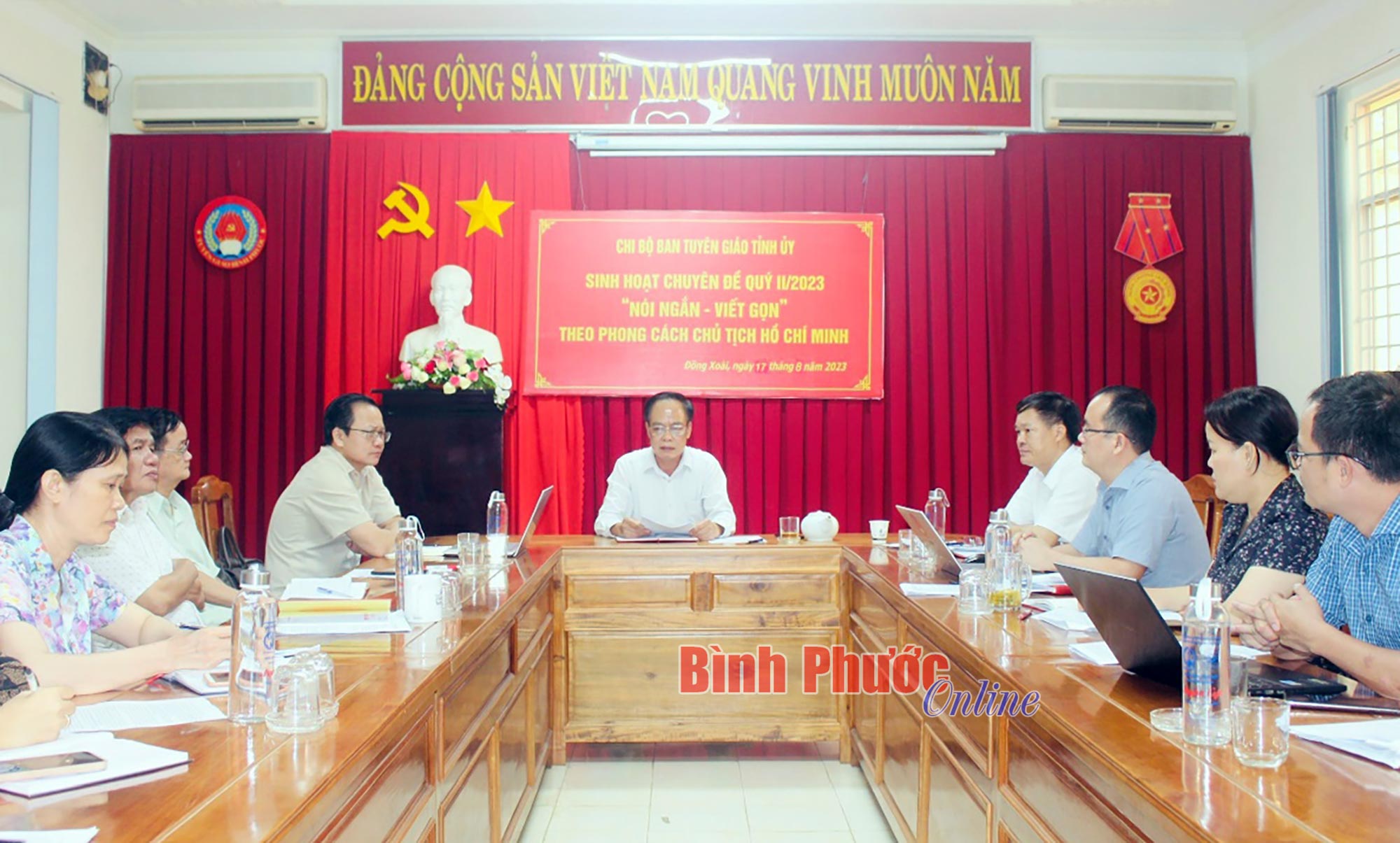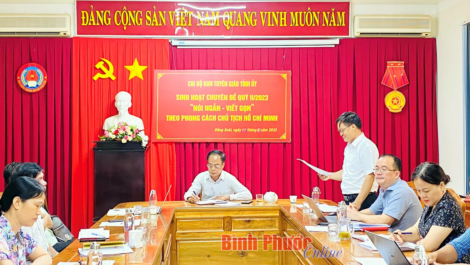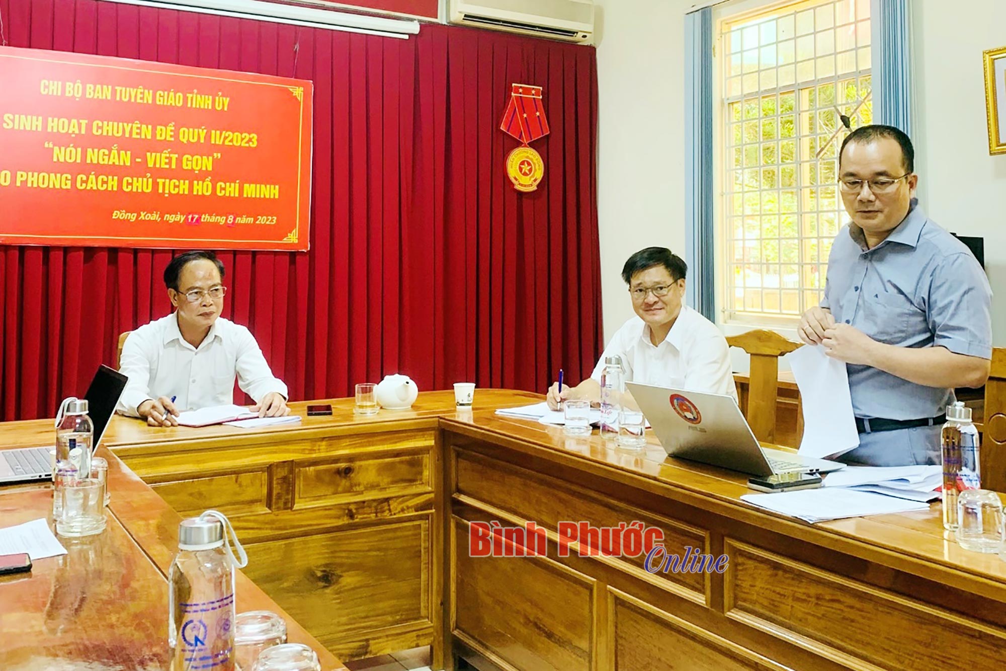 Tại buổi sinh hoạt chuyên đề, các đảng viên cũng đã thảo luận, làm rõ vấn đề chủ đề sinh hoạt “nói ngắn, viết gọn”. Đồng thời thông qua buổi sinh hoạt chuyên đề “nói ngắn, viết gọn” bổ sung một kỹ năng cần có của cán bộ, đảng viên Ban Tuyên giáo Tỉnh ủy hiện nay, thể hiện sự tôn trọng người nghe, người đọc. Là sự thể hiện năng lực tư duy, năng lực tổng hợp, năng lực vận dụng, là cái biểu hiện đầu tiên và cụ thể nhất của “viết rành, nói giỏi”.
