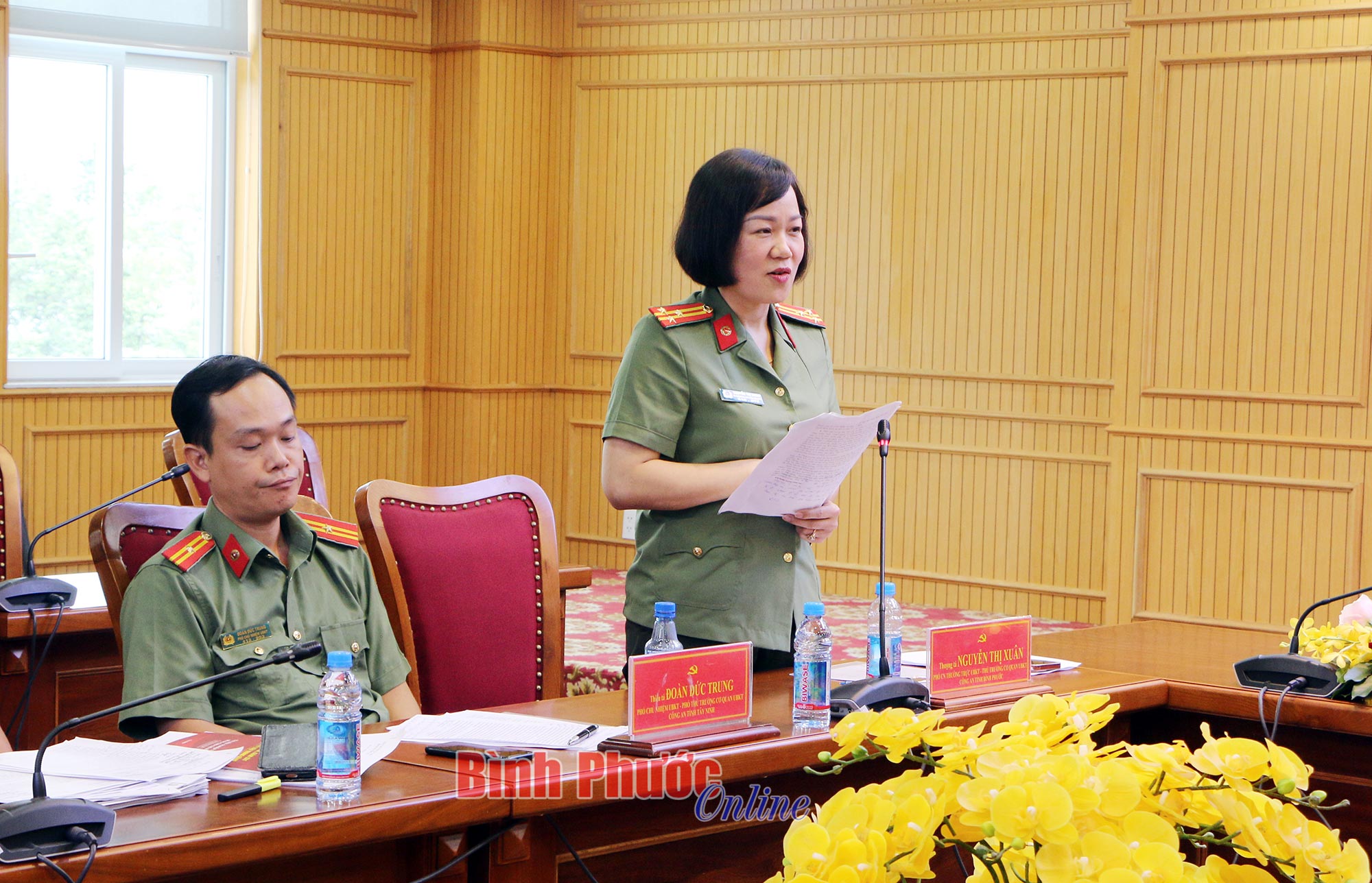 Thượng tá Nguyễn Thị Xuân, Phó Chủ nhiệm Thường trực UBKT Đảng ủy Công an tỉnh Bình Phước báo cáo một số kết quả tại buổi tọa đàm