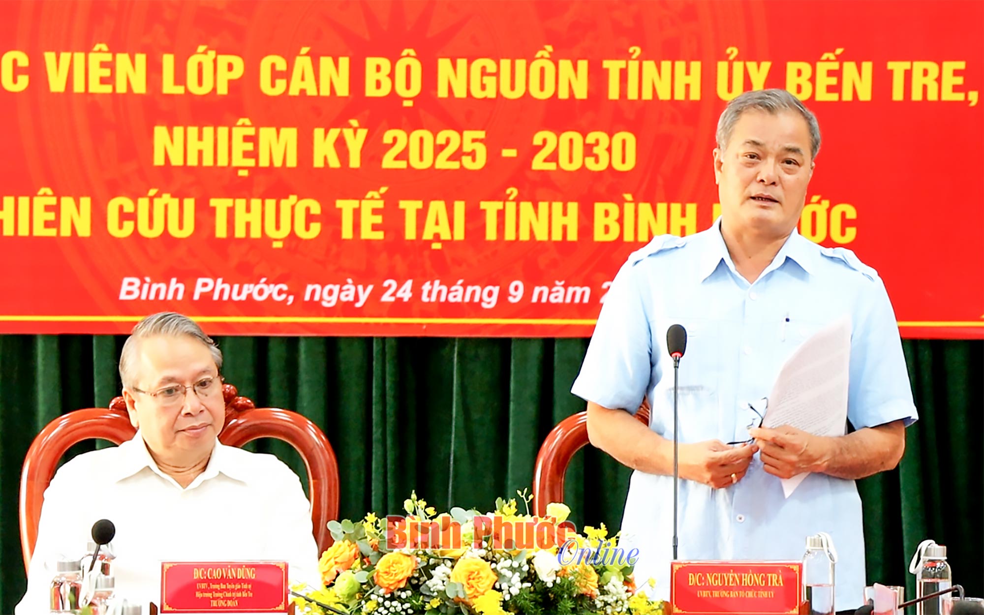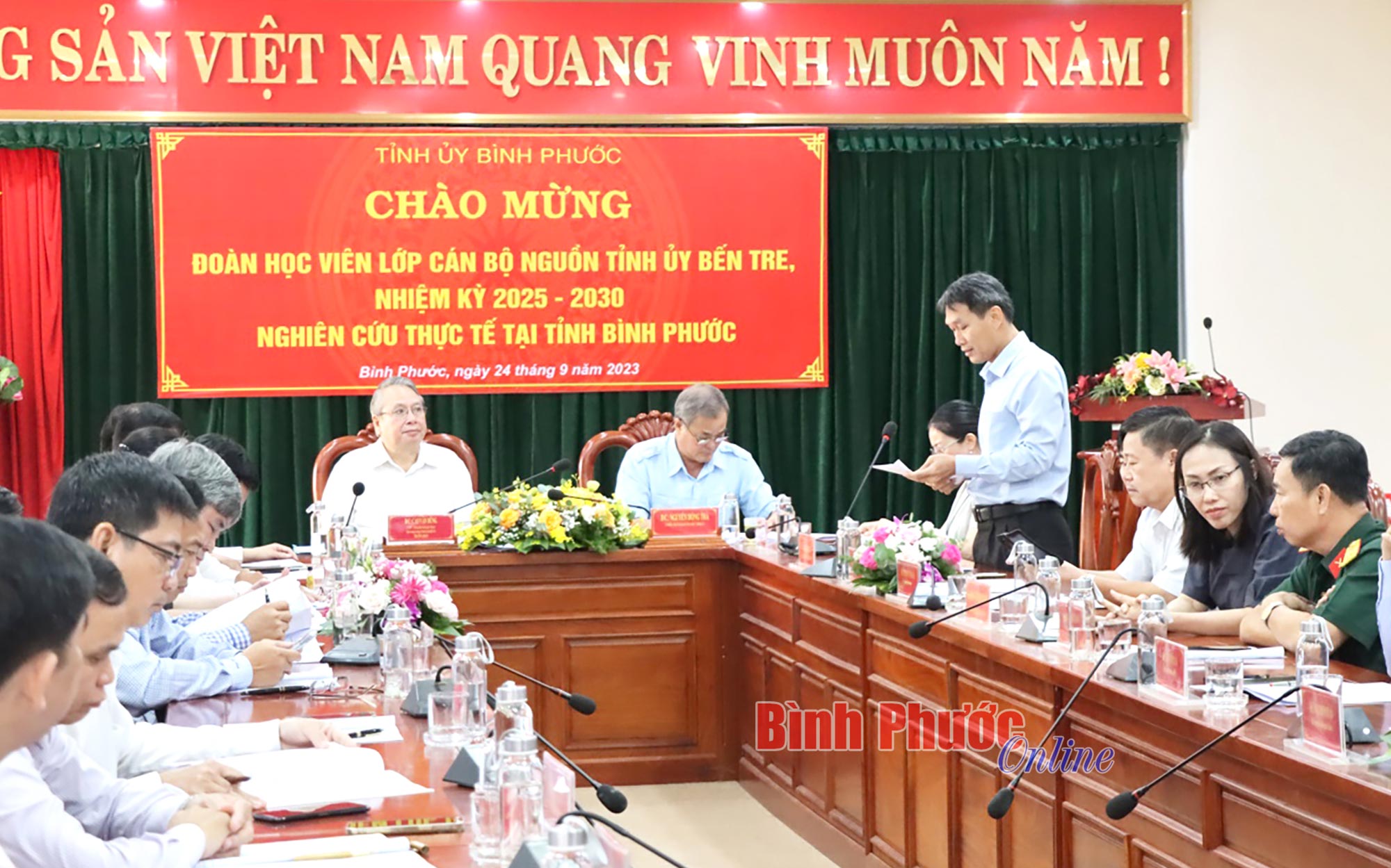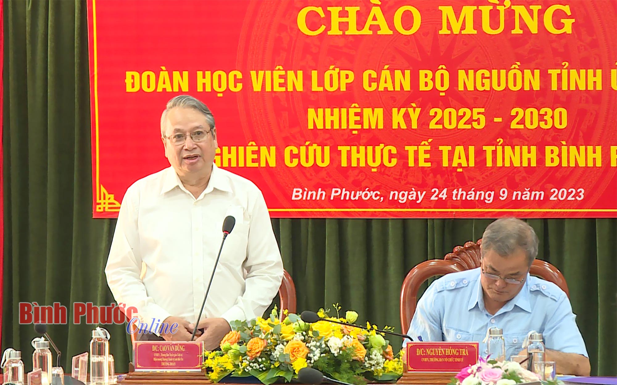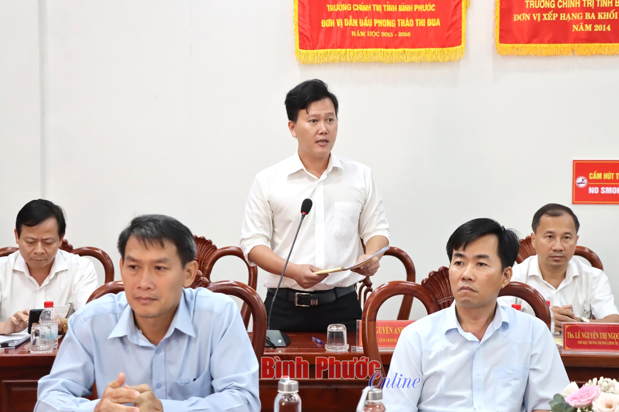 Phát biểu tại buổi tiếp, Trưởng ban Tuyên giáo Tỉnh ủy, kiêm Hiệu trưởng Trường Chính trị tỉnh Bến Tre Cao Văn Dũng cảm ơn sự đón tiếp nhiệt tình của lãnh đạo tỉnh Bình Phước đối với đoàn. Đồng thời, thông tin về kế hoạch đi thực tế của đoàn học viên.
