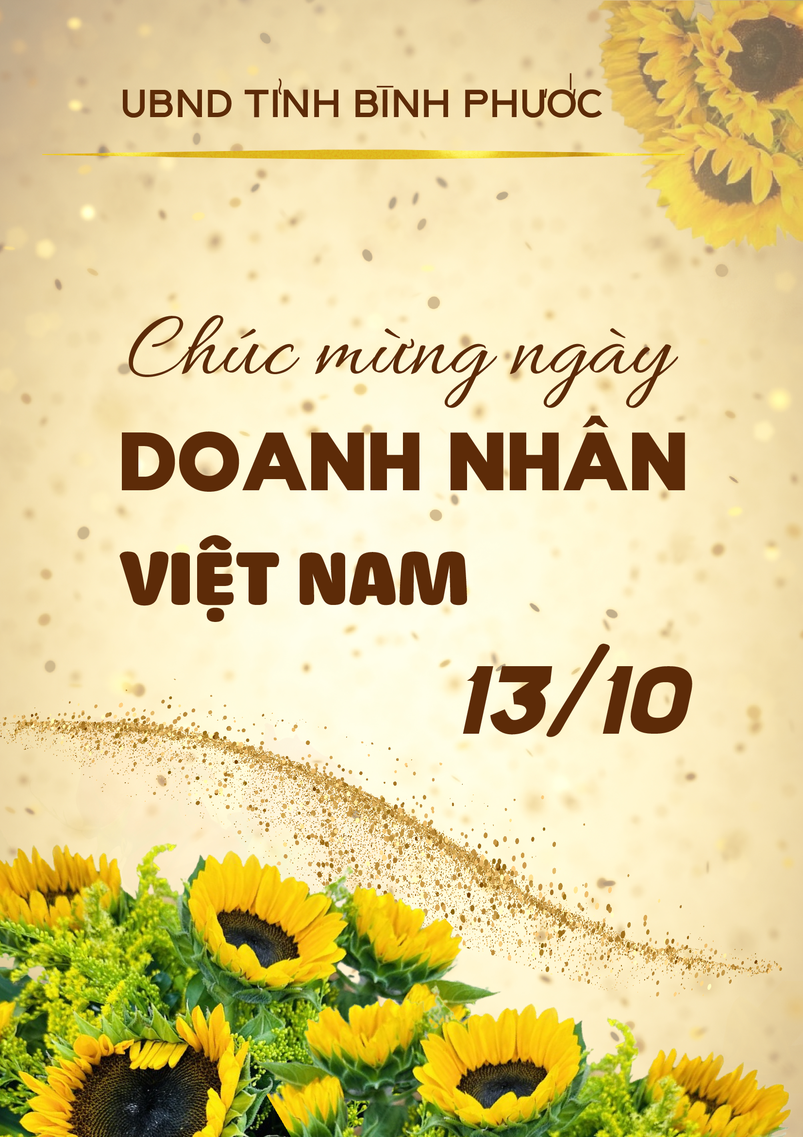 Nhân ngày vui của cộng đồng Doanh nhân Việt Nam (13-10-2004 - 13-10-2023), Ủy ban nhân dân tỉnh Bình Phước kính chúc toàn thể đội ngũ doanh nhân mạnh khỏe, thành công, lớn mạnh hơn nữa và tiếp tục đồng hành cùng vượt qua khó khăn, thách thức, góp phần quan trọng vào sự phát triển của đất nước và của tỉnh; luôn chia sẻ, đồng hành cùng chính quyền và nhân dân Bình Phước trong công tác an sinh xã hội, đền ơn đáp nghĩa, giảm nghèo bền vững... Tất cả vì một Bình Phước thân thiện, nghĩa tình và phát triển.