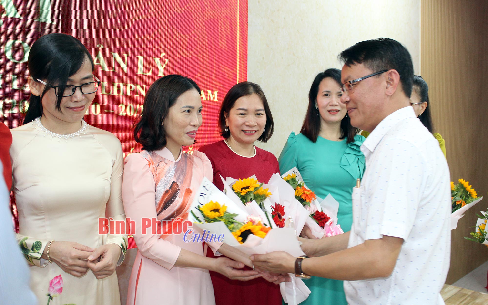 Bí thư Huyện ủy Bù Đốp Dương Thanh Huân tặng hoa và chúc mừng cán bộ nữ lãnh đạo quản lý nhân dịp họp mặt 20-10