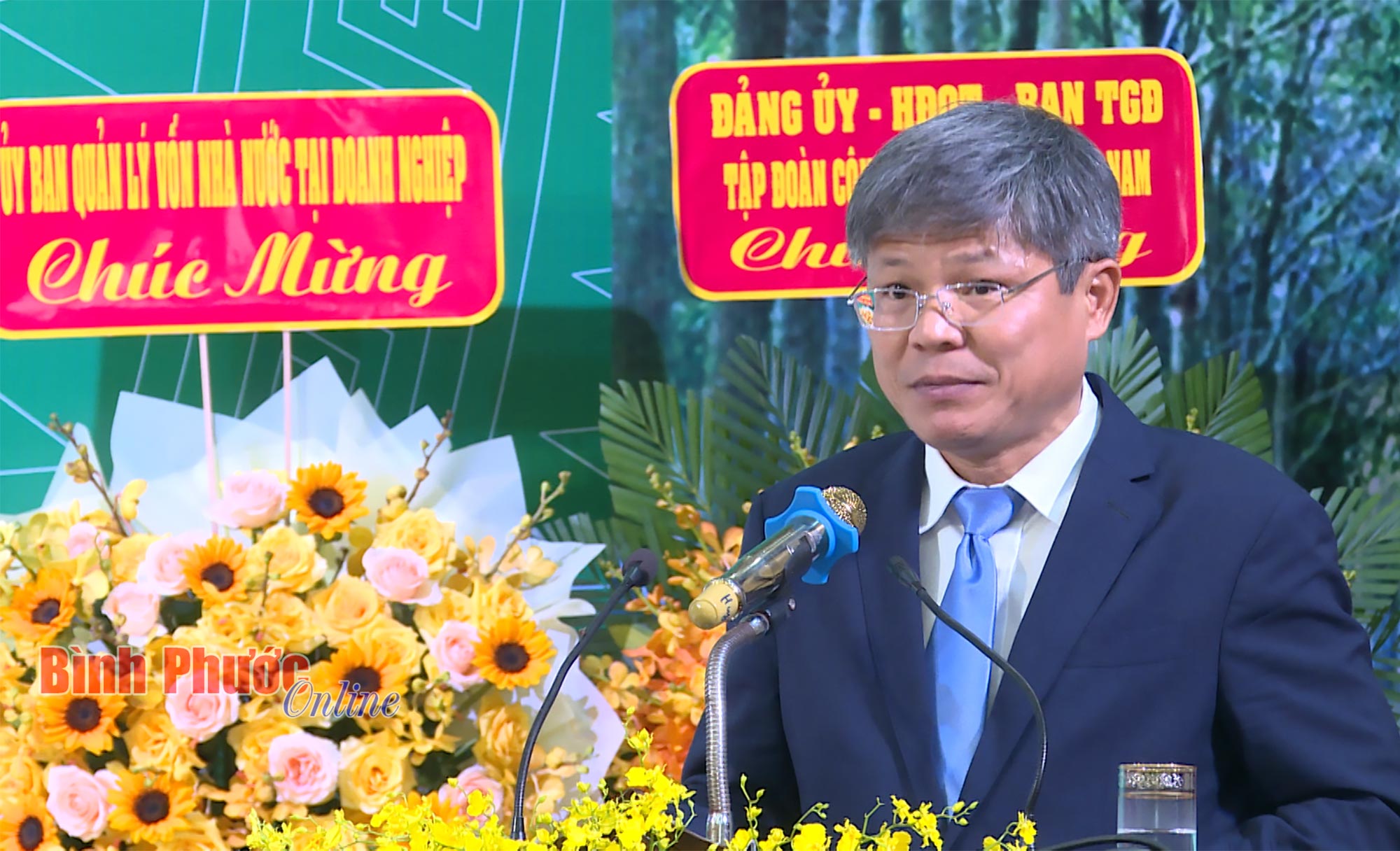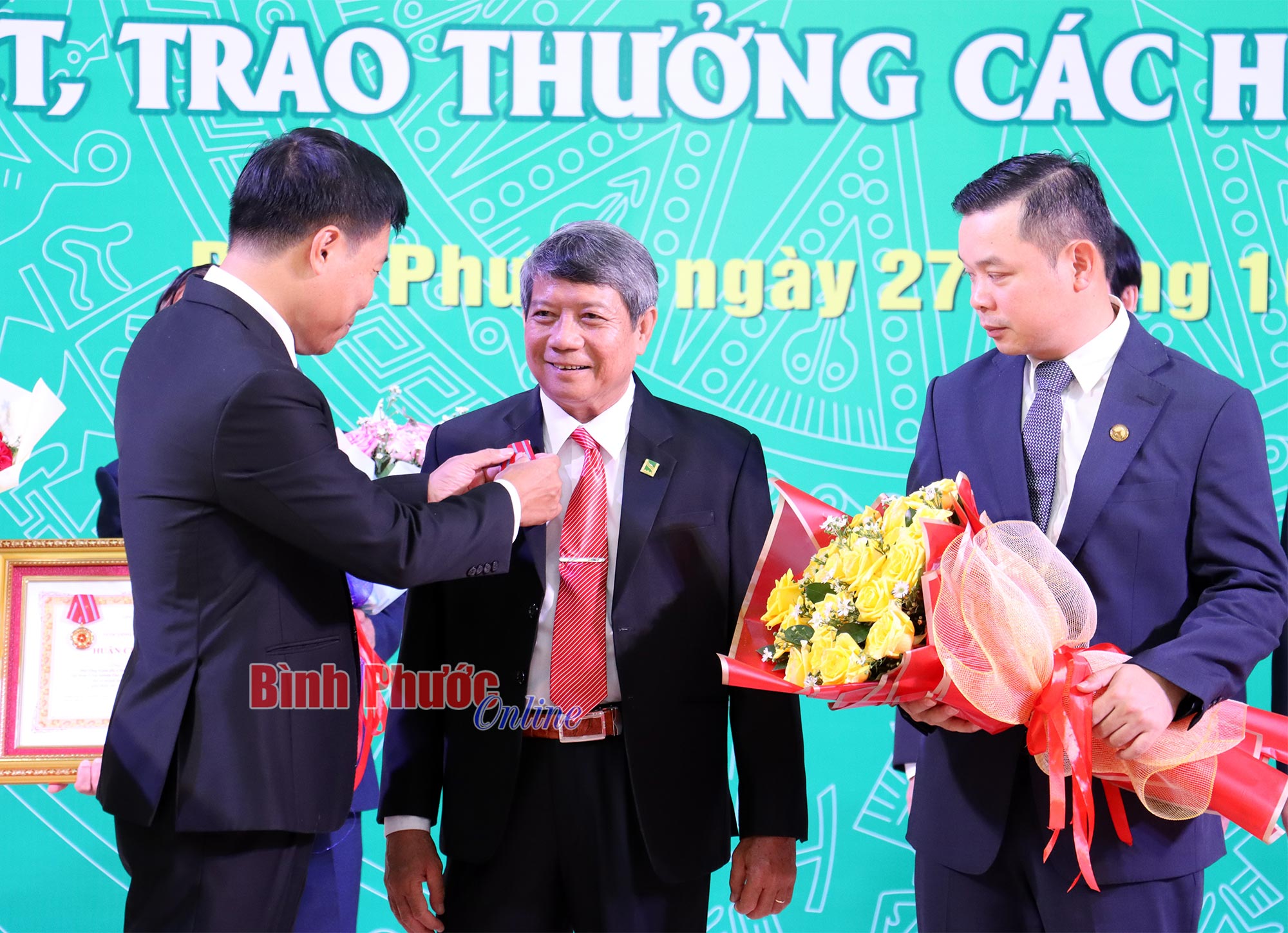 Thừa ủy quyền Chủ tịch nước, Ủy viên Trung ương Đảng, Bí thư Tỉnh ủy Bình Phước Nguyễn Mạnh Cường và Phó Chủ tịch Ủy ban Quản lý vốn Nhà nước tại doanh nghiệp Đỗ Hữu Huy trao Huân chương Lao động hạng Ba và hoa cho các tập thể, cá nhân