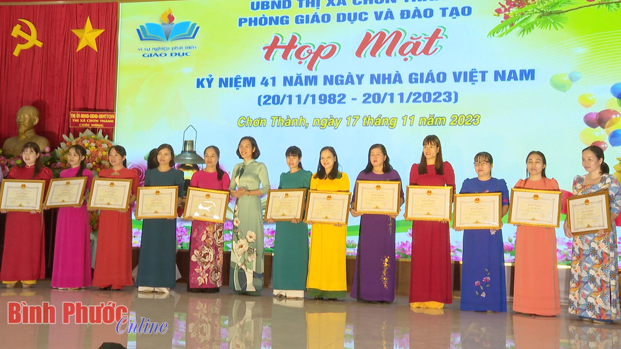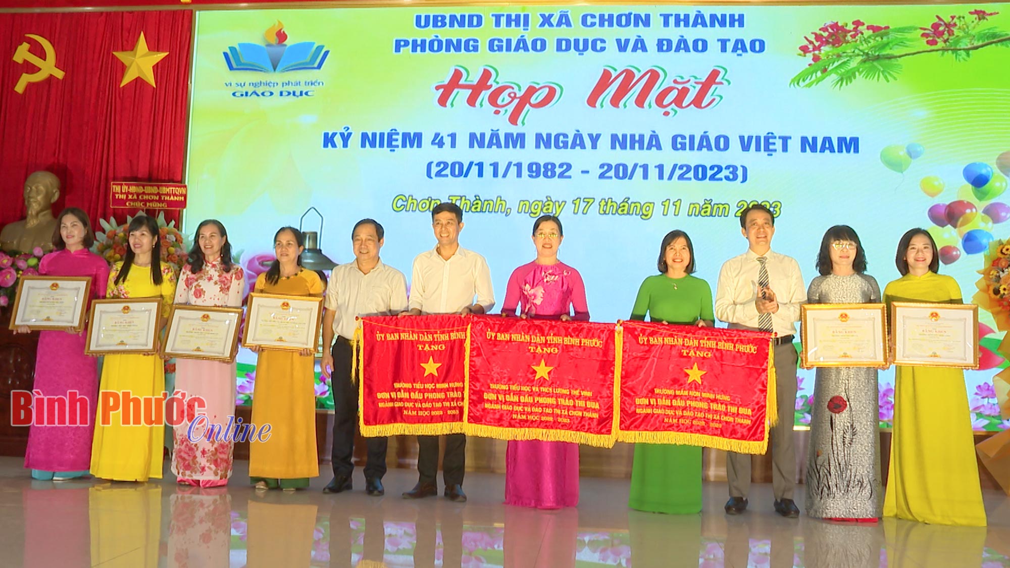 Dịp này, ngành giáo dục thị xã Chơn Thành có 1 cá nhân được tặng Bằng khen của Thủ tướng Chính phủ, 1 tập thể được tặng Bằng khen của Bộ Giáo dục và Đào tạo, 3 tập thể nhận Cờ thi đua của UBND tỉnh; 6 tập thể và 39 cá nhân được tặng Bằng khen của UBND tỉnh.