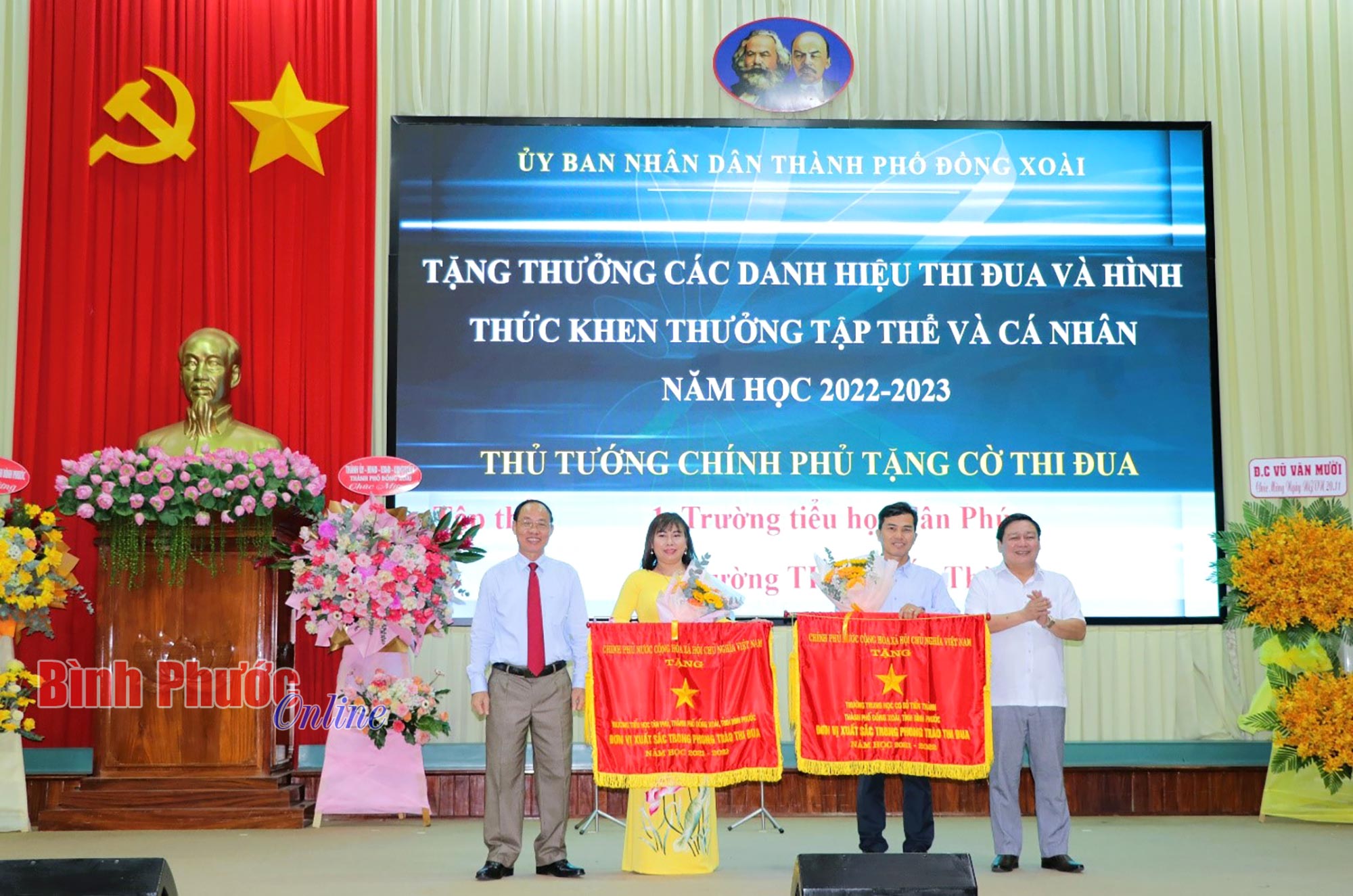 Tiến sĩ Trần Ngọc Thắng, Phó Giám đốc sở Giáo dục và Đào tạo; Ủy viên Ban Thường vụ Tỉnh ủy, Bí thư Thị ủy Chơn Thành Lê Hoàng Lâm tặng Cờ thi đua và Bằng khen của UBND tỉnh cho các tập thể