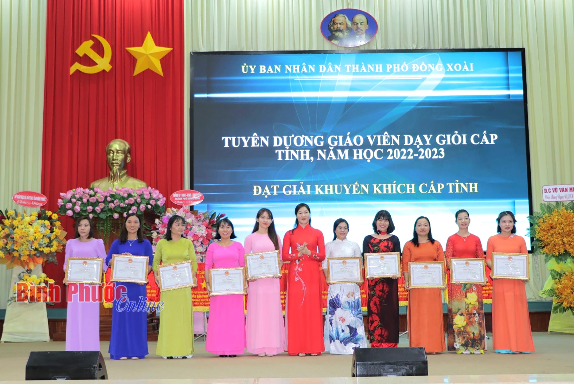 Phát huy truyền thống, những năm qua toàn ngành giáo dục thành phố Đồng Xoài luôn đoàn kết, sáng tạo; nhiều thế hệ cán bộ, giáo viên tâm huyết với nghề, đóng góp công sức, trí tuệ cho sự nghiệp giáo dục. Trong kỳ thi tuyển sinh vào lớp 10 năm học 2022-2023, thành phố Đồng Xoài có điểm bình quân cao nhất tỉnh (20,3 điểm). Trong 3 năm học từ 2020 đến 2023, thành phố có 97 học sinh được công nhận giỏi cấp tỉnh; 172 giáo viên mầm non, tiểu học và THCS đạt giỏi cấp tỉnh. Thành phố Đồng Xoài cũng vượt chỉ tiêu tỉnh giao về xây dựng trường chuẩn quốc gia. Đến tháng 11-2023, thành phố có thêm 6 trường được công nhận chuẩn quốc gia, nâng tổng số trường chuẩn lên 22/31 trường, đạt 71%.