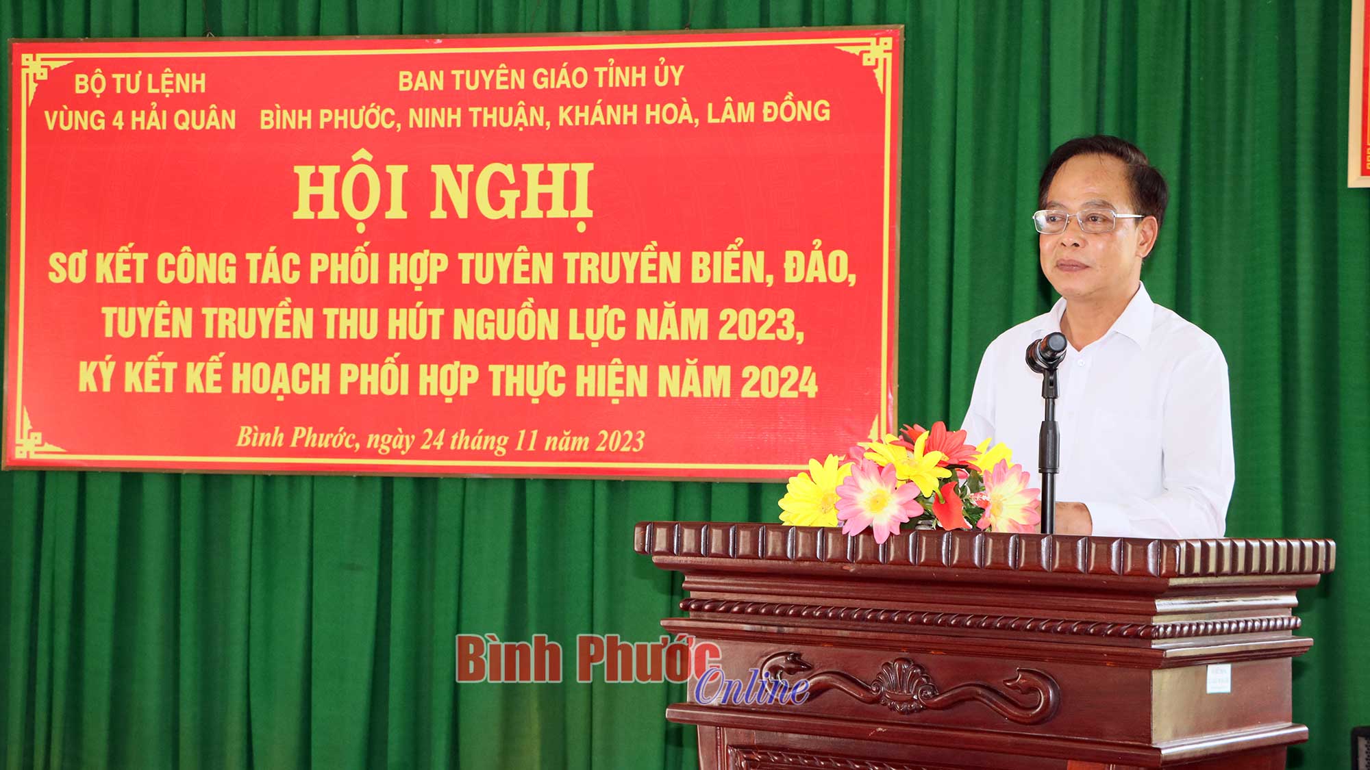 Báo cáo tại hội nghị cho biết: Trong năm 2023, Bộ Tư lệnh Vùng 4 Hải quân phối hợp với Ban Tuyên giáo 4 tỉnh đã triển khai toàn diện các nội dung trong kế hoạch công tác phối hợp tuyên truyền biển, đảo, tuyên truyền thu hút nguồn nguồn lực năm 2023 với nhiều cách làm mới, sáng tạo, hiệu quả.